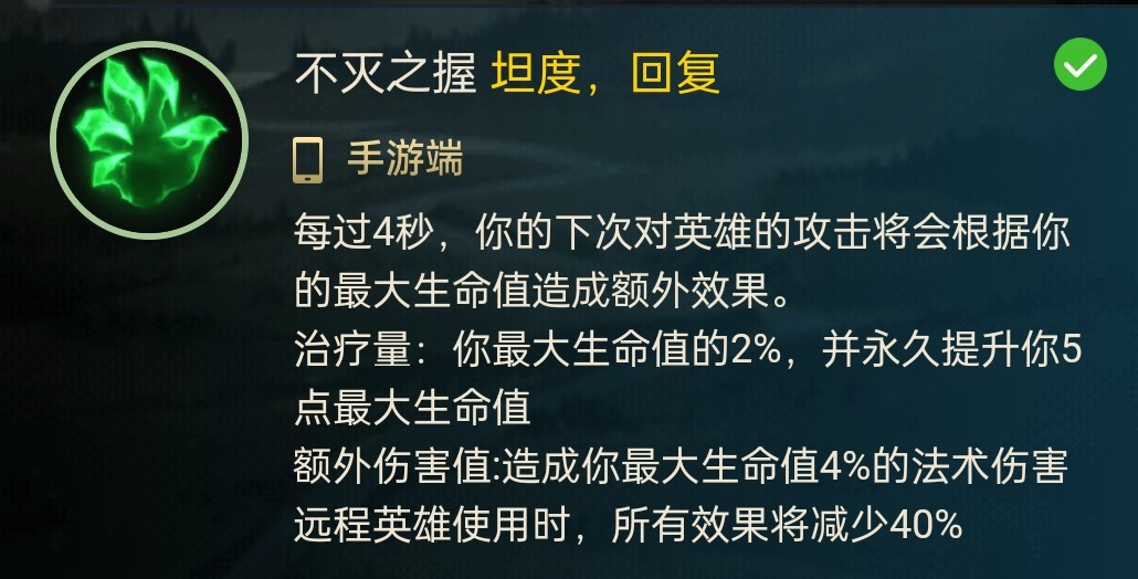 伤害和治疗值都是随着自身血量提高而提升,坦克英雄必备的基石。优点:不灭之握的冷却时间短且触发比较简单,有伤害也有回复,适合两个近战英雄之间的频繁换血,每一次触发都能增加最大生命值,从而提升后期的能力。缺点:对线型基石,团战中收益没有征服者大。