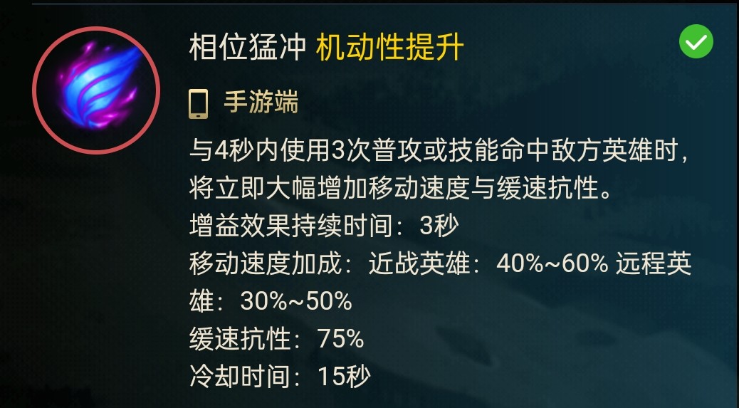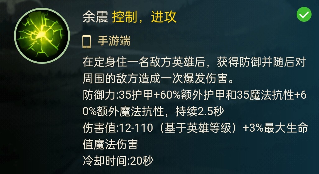 坦克、硬辅先手很好的一个基石。优点:余震在游戏前期收益比较大,触发余震后提供大量的双抗加成,在这几秒期间会非常的肉,还能对周围的敌方英雄造成伤害。缺点:冷却时间很长。