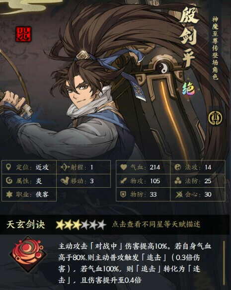 ②六星殷剑平主动攻击可提高20%的伤害加成,加之强力的追击/连击技能,可造成极其有力的输出效果。