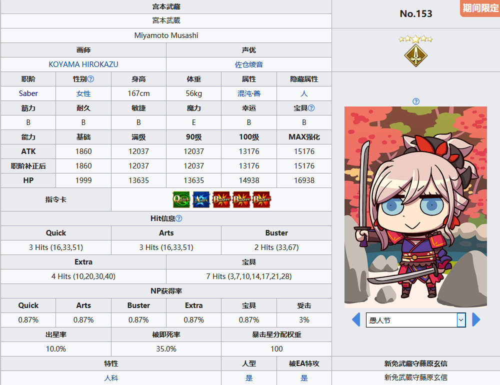 综合来看,宫本武藏是一名偏向高难的红卡单体,宝具有前置宝具威力提升,还有两个职阶的特攻,最后还有解除敌方强化状态,技能有解弱体,红魔放,无敌出星率,还有特别的一技能,宝具伤害超高,个人感觉是没什么缺点,硬要说的话就是属于武藏的红卡时代已经过去了,不过这并不影响这位极其强力又极具人气厨力的从者。