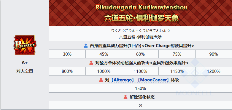 自身宝具威力提升(oc效果提升)对敌单体发动超强大攻击,对他人格和月之癌特攻,解除强化状态。