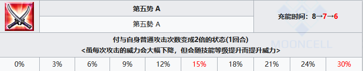 这个技能可能算是全游戏里最特别的了,攻击次数变为两倍,简单解释一下,一个从者的打N P能力和打星能力大部分取决于一个hits数,将这个数值变为两倍,就蓝卡来说,等同于一个100%的N P率,绿卡也会多很多N P量和星星,红卡倒是没什么效果,ex也有效果,很强的技能,这也是有时候会出现武藏一张蓝卡暴击打满*的情况。