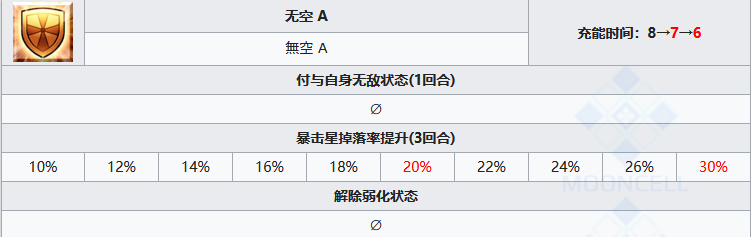 三技能无空赋予自身无敌状态,增加出星率,解除弱化状态。无敌很棒,这个类型的防御强化是属于最高级的,出星配合一技能来为自己提供暴击,解除弱化很实用。