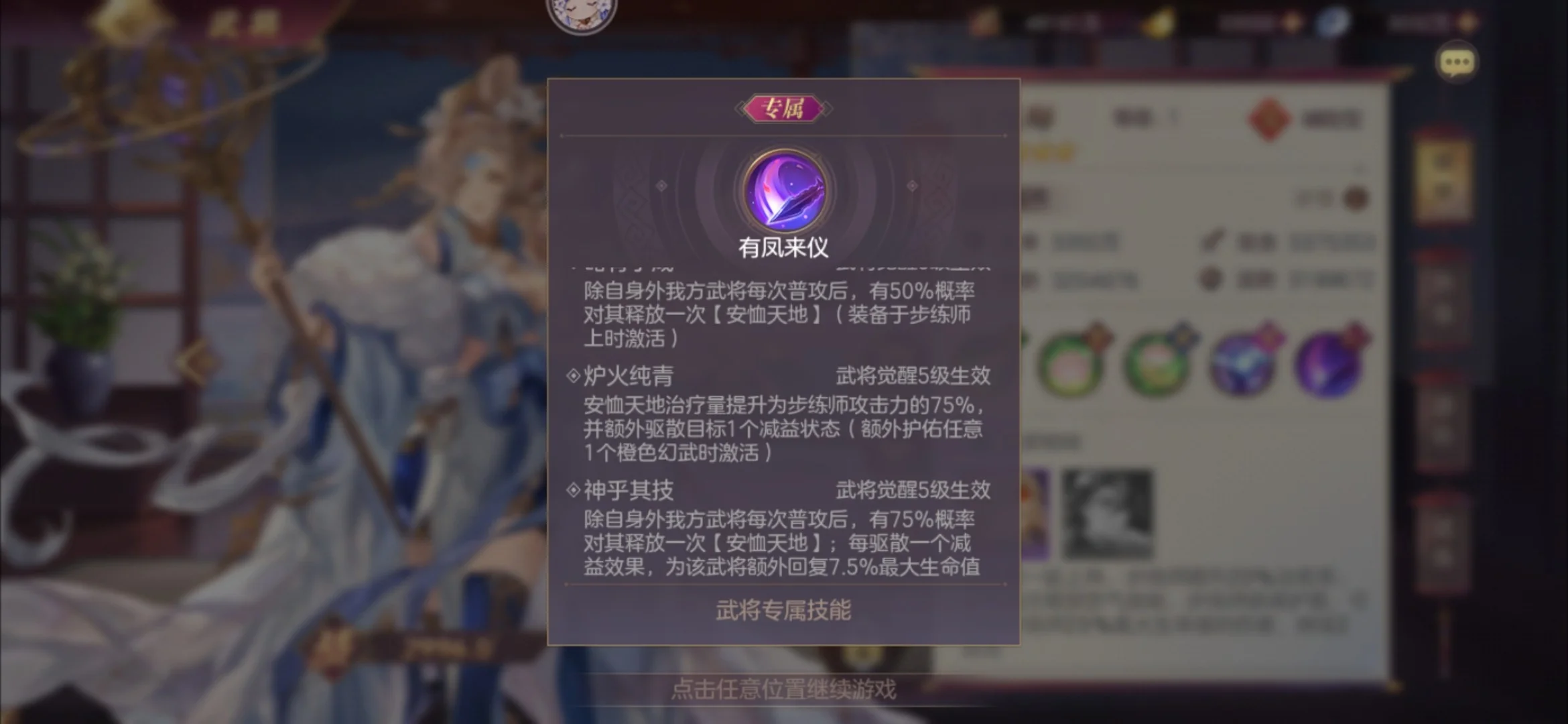 步练师是本次专武中我个人比较看好的一个点,仅看好专武效果,并不代表下个版本一定很强。步练师本身就拥有很好的急救能力和清减益,本次专武附加了一个队友普攻75%概率追加一次被动回血的效果,并且会额外驱散一个减益buff,配合当下最热门的姜维,一回合多频率的普攻可以保证全队的血量。注意,清除减益除了被动外,怒攻的清除也是包括在内的,每清除一个减益会额外回复7.5%最大生命值。