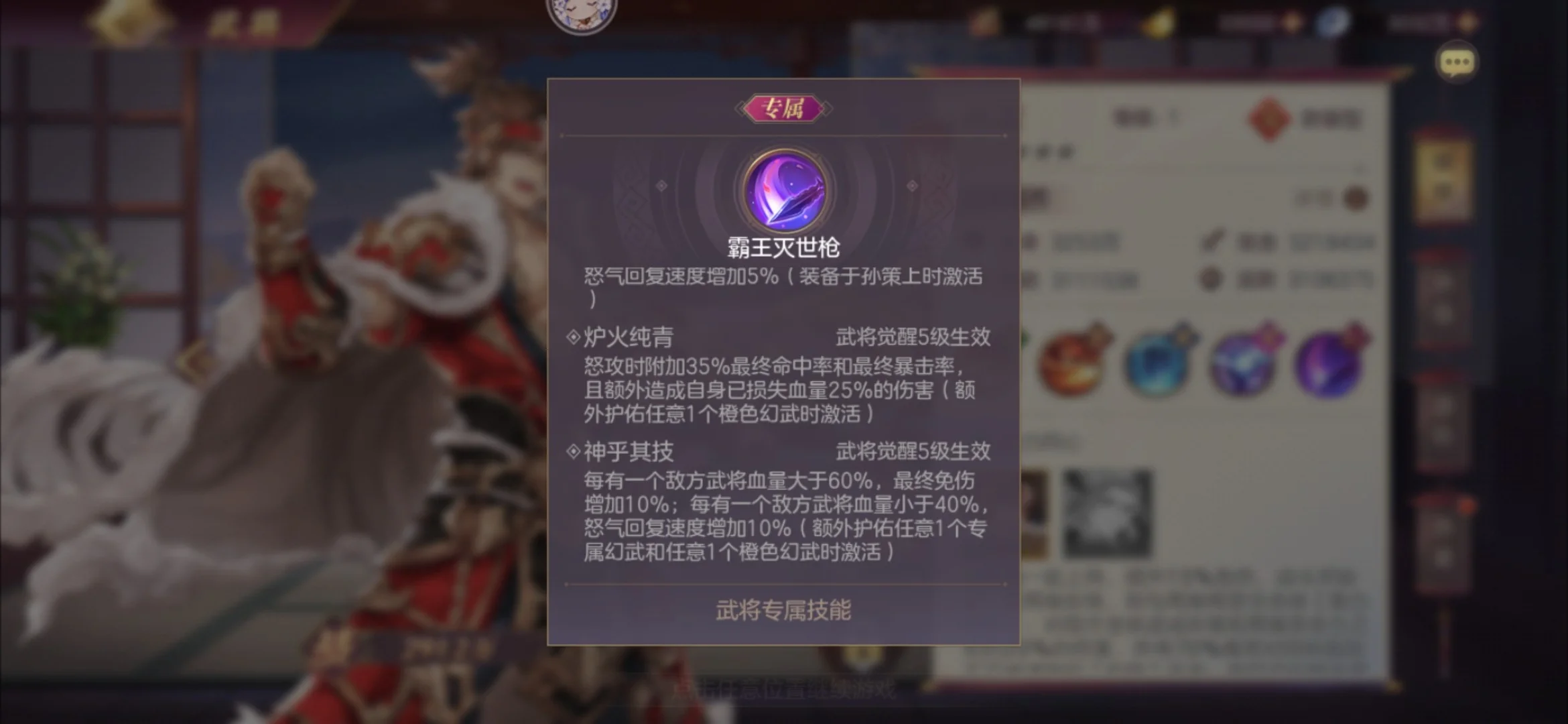 对于孙策,我个人的心情是极其复杂的。孙策的个人定位很明显是一个斩杀将,但是出于羁绊是和周瑜配合,再加上一些被人诟病的东西,总体效果很差。本次专武增加了35%最终命中和最终暴击,并且怒攻时会额外附加25%已损生命值的真伤,算是小小得提了一波伤害。每有一名武将在60%血量以上,获得10%最终减伤,每有一名武将40%血量以下获得10%怒气回复速度,总体来说是提高了孙策个人的续航能力和输出能力,以及开局的坦度。但是放在火队中还是有些不伦不类。具体效果有待开发。