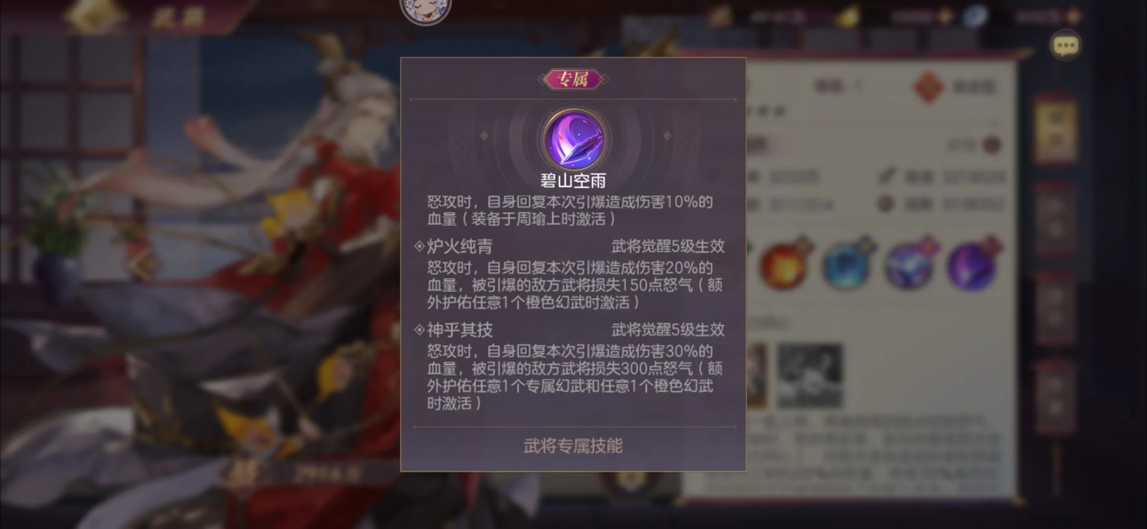 周瑜的专武增加了回复和降怒能力,引爆时回复30%本次引爆伤害的血量,并降低敌方被引爆武将300怒气。回血或许可以提高一些火队的坦度,以免出现陆逊被击杀崩盘的结果。降怒在普遍情况下基本是很难实现了,大量的诸葛果+诸葛亮导致了降怒的夭折。