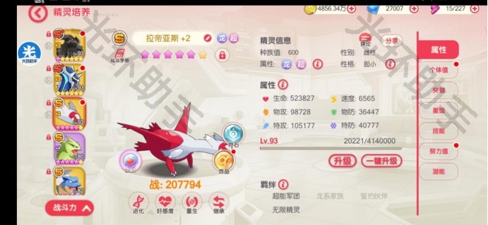 开局前两回合50+%的闪避率,很大几率无伤吃掉对面前两回合的爆发。3拉蒂欧斯完全可以当一个副C(前几回合),一个高练度的拉蒂欧斯伤害十分可观,放前排可以让水都兄妹更快开合击技。虽然水都兄妹放前排很脆,但是