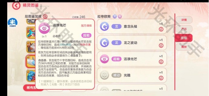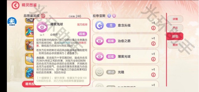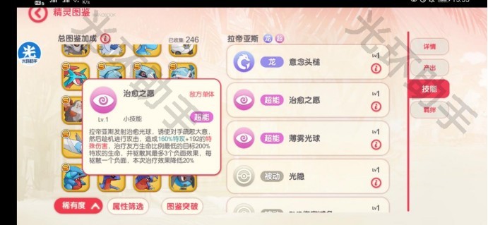 拉帝亚斯的小技能是超能系,回复友方生命比例最低精灵200%拉帝亚斯特工的生命值,并为其驱散最多3个负面效果。实测:因为是辅助,所以一般都不会大力培养,所以回复的生命值比较有限,但是驱散负面效果有时候会有奇效。