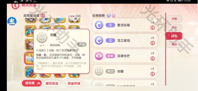 被动拉蒂欧斯的又一个亮点就是它的被动——光隐-阳,效果:无法被选中两个大回合,不可驱散(但是可以被范围伤害波及),状态结束后永久提升10%速度,8星之后,每提升5%速度,提升10%特伤加成,这个加成可以和它的小技能配合增加输出能力。