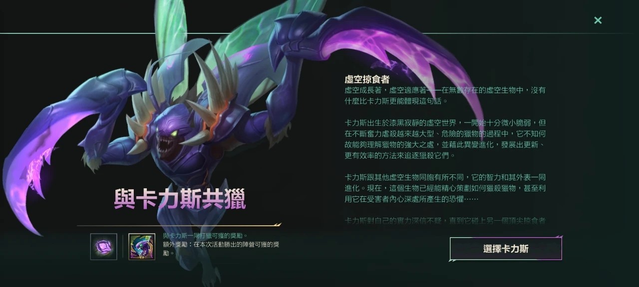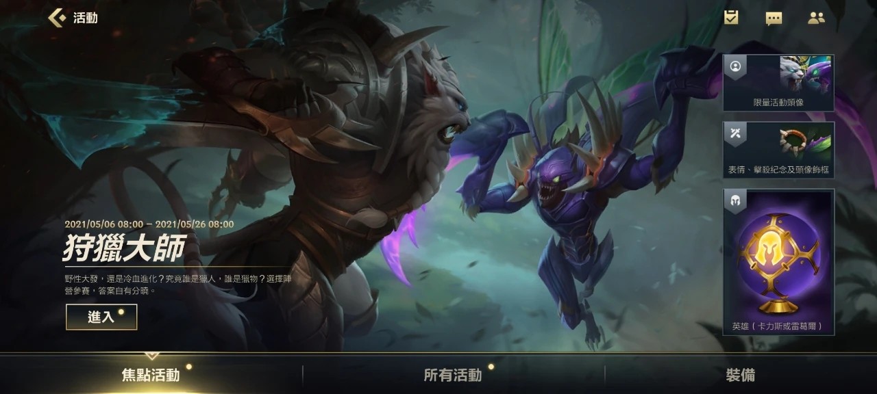 活动结束后,赢得狩猎比赛的阵营可以获得额外头像「峡谷之王」雷恩加尔阵营或「顶级掠食者」卡兹克阵营。落败的一方还可以获得经验、金币加成卡补偿。此外,胜出的阵营可以在一周内继续使用重生标记,证明自己才是最强的猎人!