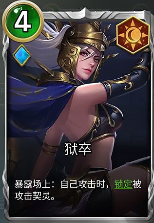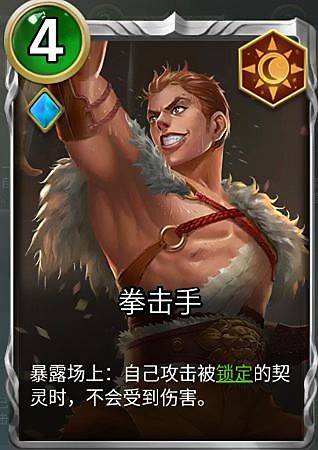 狱卒自带锁定攻击对象的特质,可以完美的克制遗言、巡逻等效果,单卡强度较高,推荐卡牌中带满。拳击手攻击锁定契灵不受伤害,可以配合冰雪少女、驯熊人等具有锁定效果的契灵,在卡组中融合度较好,能较好的利用锁定效果,打开卡差。