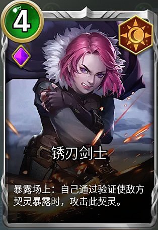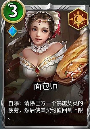 锈刃剑士的技能是只要对方契灵被翻开必被消灭,相当于白挣一点行动力,这在一回合的交锋中还是比较关键的,多一点行动力就多了一份胜算;其和面包师配合则可以再挣行动力,这一来一回就相当于自身比对方多行动了整整一天!可以逐渐的扩大优势,距离胜利更近一步!