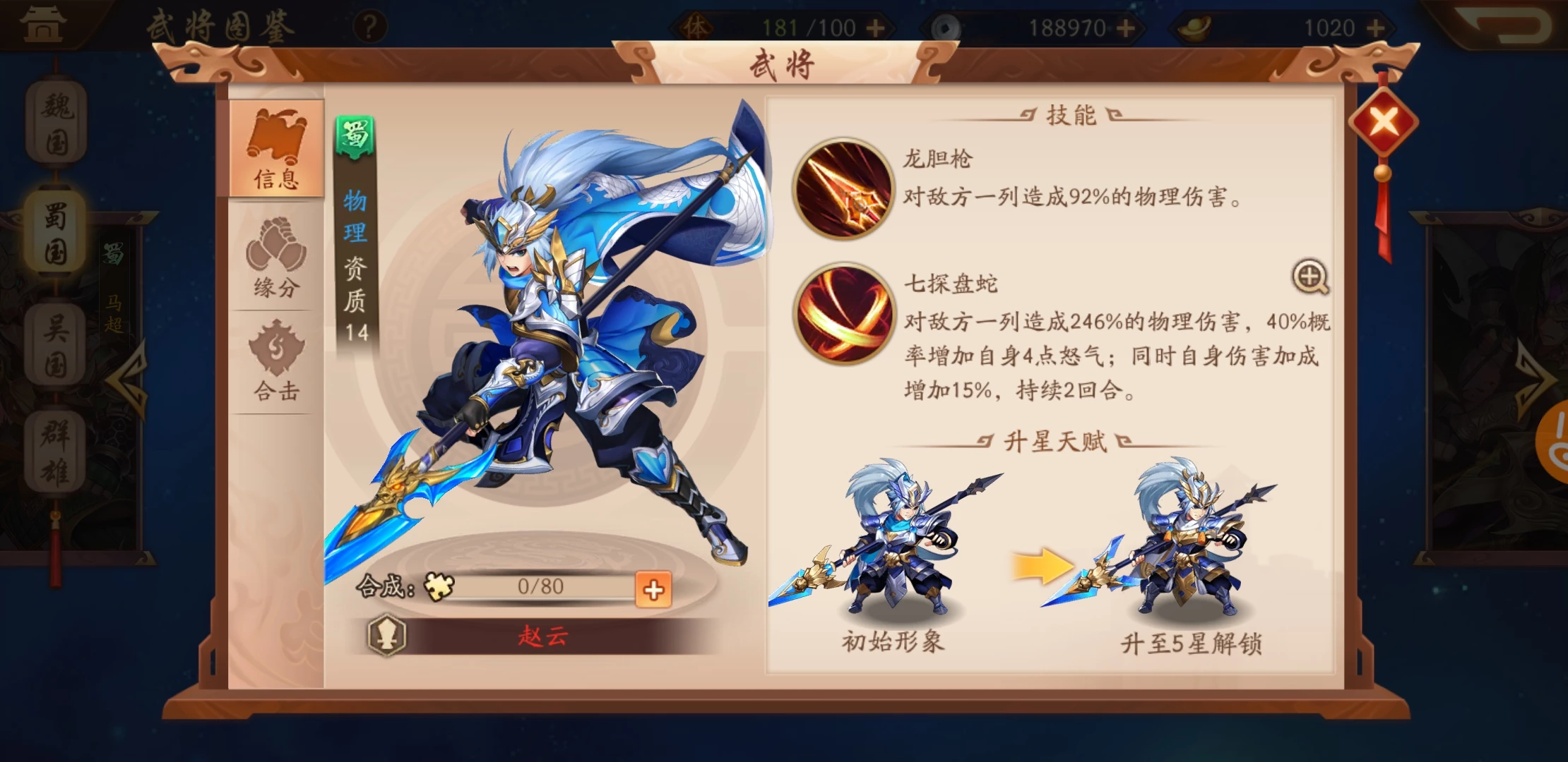 赵云,无论是在游戏内和游戏外都有着超高的人气。横排攻击,大概率回复4点怒气,且提升自身伤害20%,四个缘分都是攻击缘分,大量的攻击力加持,蜀国当之无愧的主C,运气好的话,怒气不断,绝技不断,能打出成吨的伤害。无论PVP还是PVE都是一把好手。