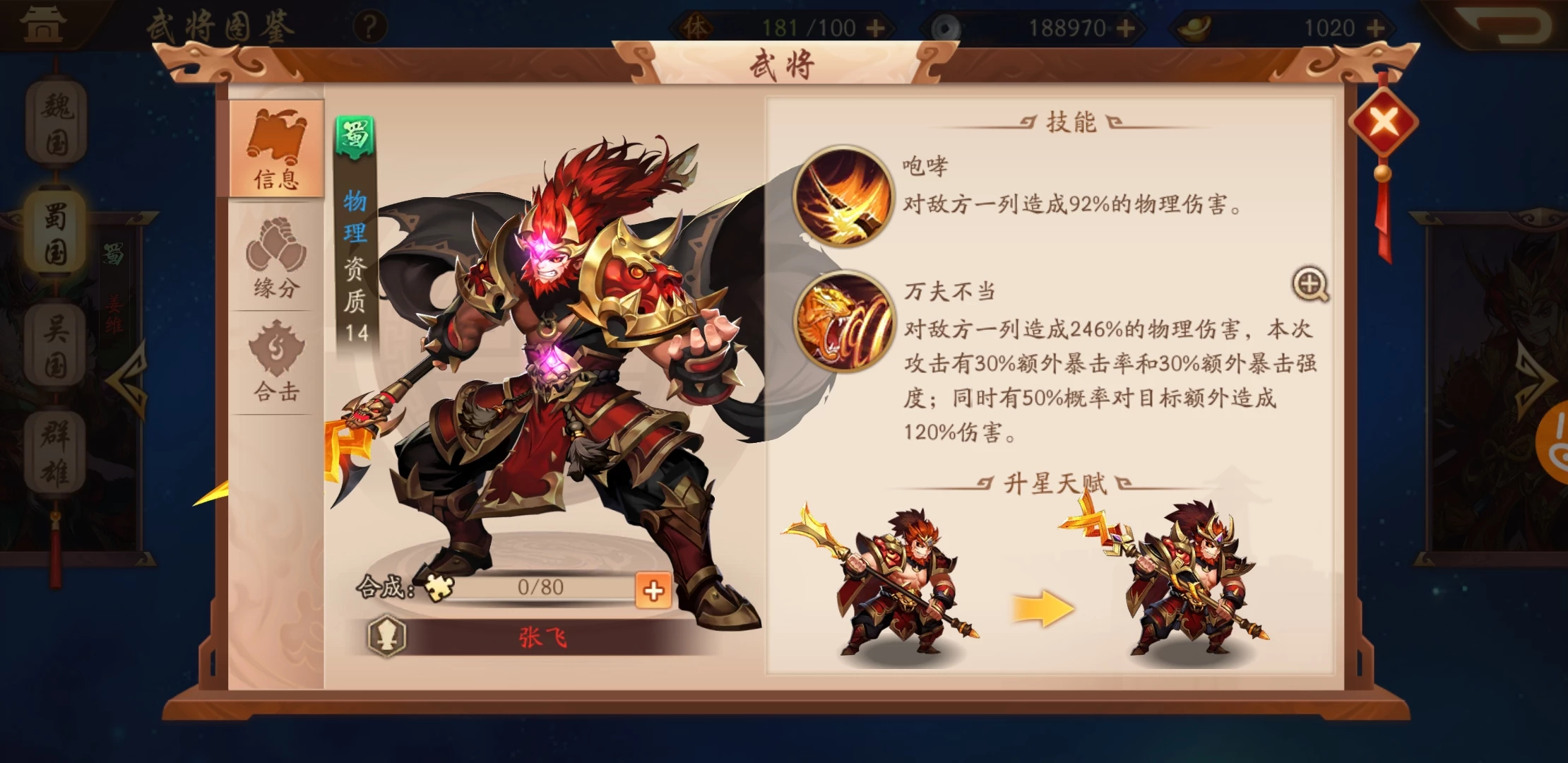 张飞,和赵云同样是横排攻击,不过张飞的伤害来的更加直观和直接,超高的暴击率、暴击伤害和额外伤害,配合赵云能快速的秒掉一排敌人,从而打开局面。同样是蜀国的主C之一,建议作为第二C培养。