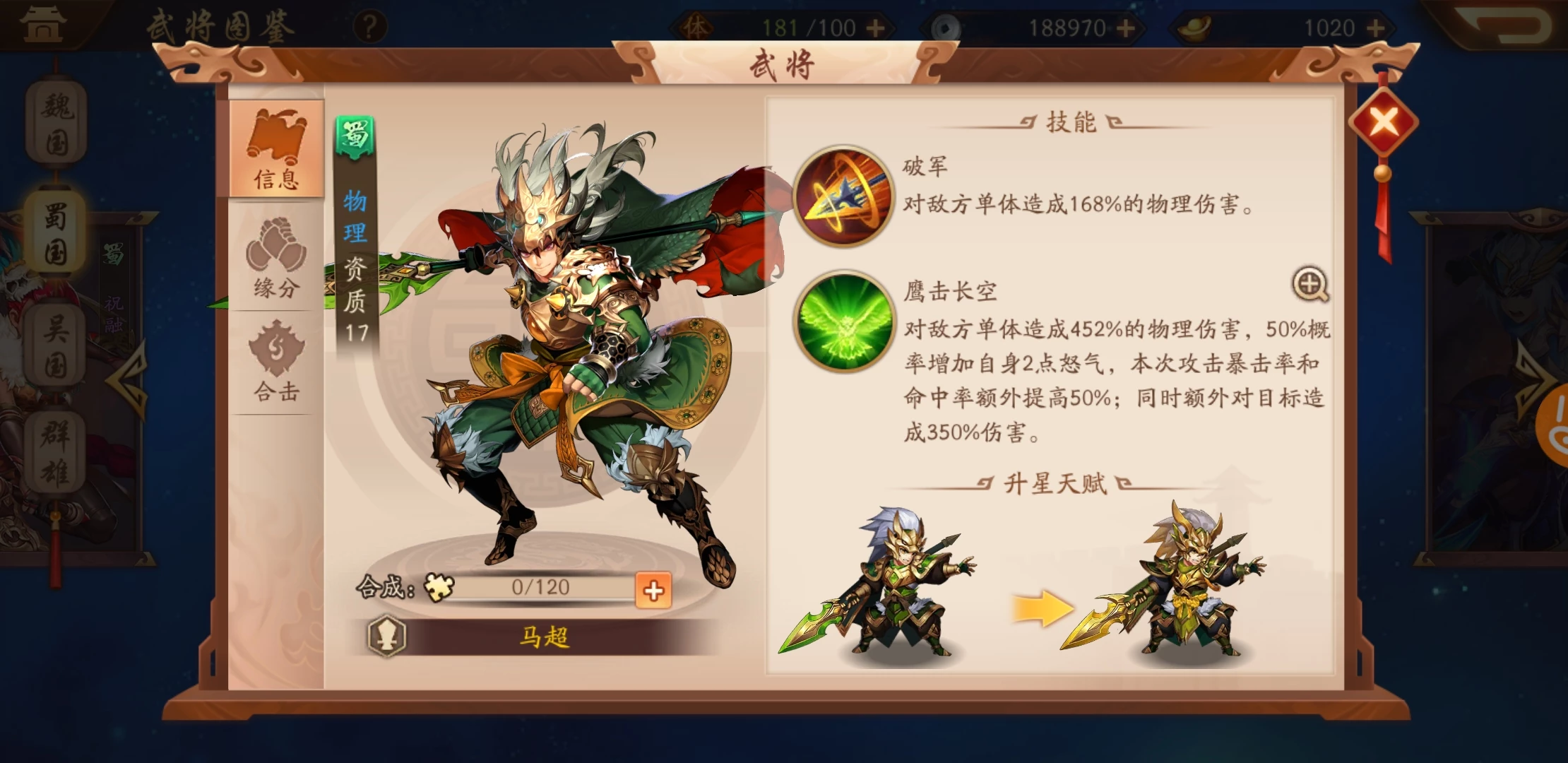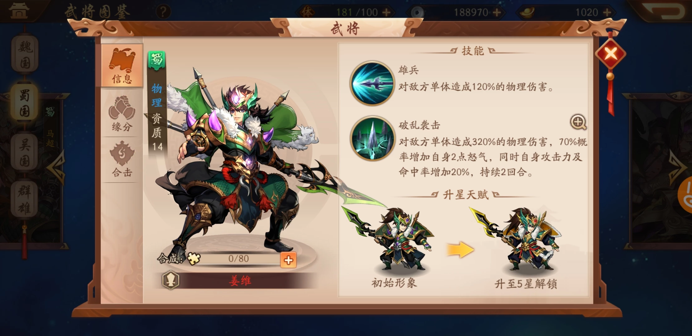 姜维,蜀国红将的点杀英雄,高概率回怒,伤害系数还不错,前期作为马超的替代品还是挺好用的,能打出不俗的伤害,而且升星较为容易,主C之一,第四C培养。