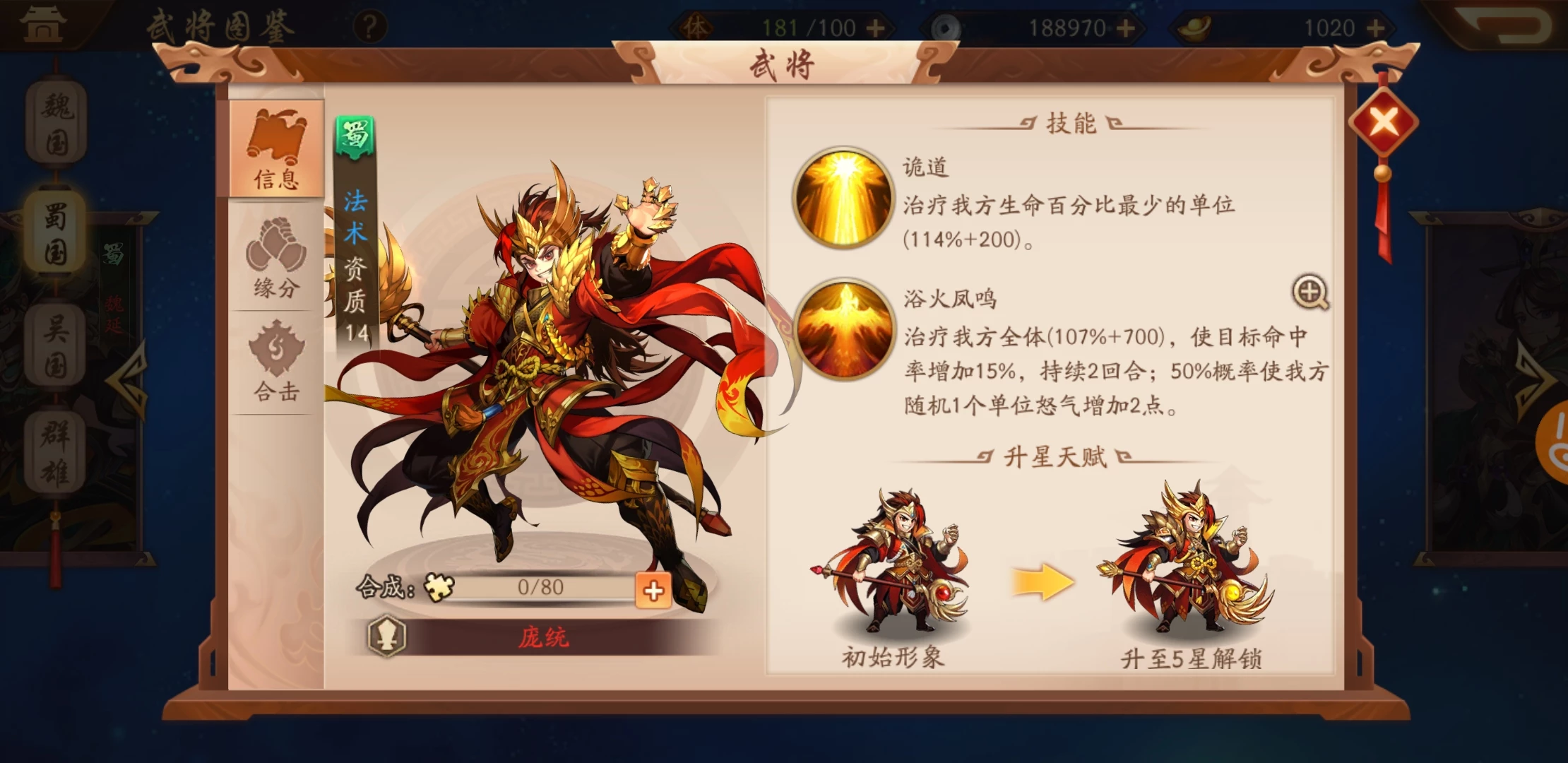 庞统,蜀国奶妈,单体回2怒,如果以后开红将升金功能,很有可能会两人2怒,可以说是非常的强力的奶妈了,培养优先级第三位。是为数不多的应该重点培养的奶妈。