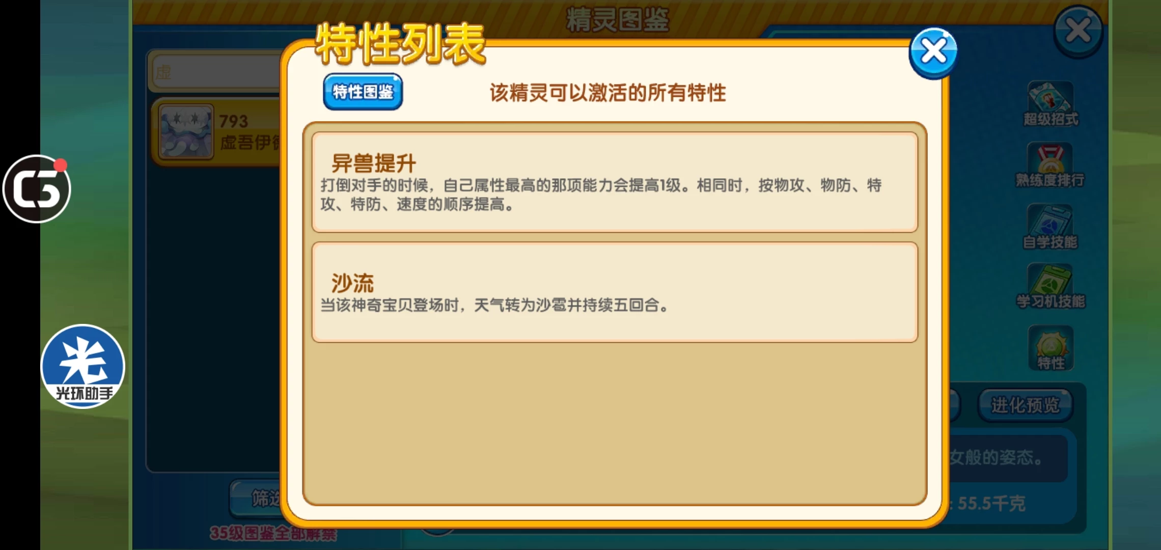 特性有两个,当然要用沙流了,沙暴天气的耗血是一方面,变相的附加特防又是一方面,综合而言,沙流特性对它来说非常适合。