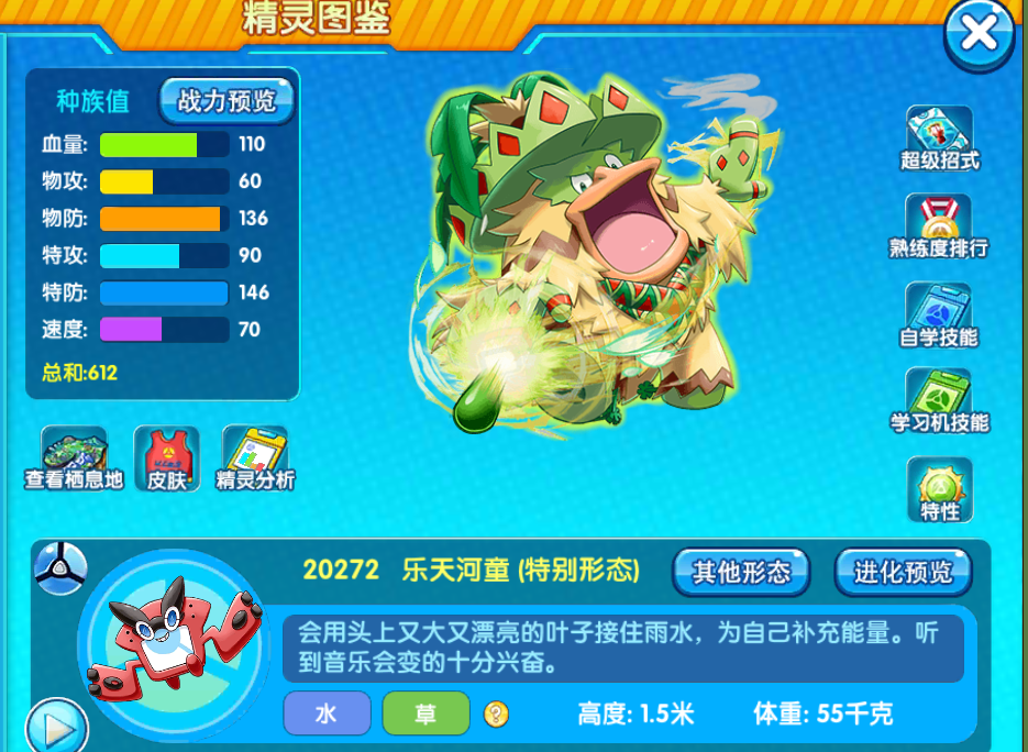 所以我给大家的建议就是首先要分析对面的巨沼怪是什么样的技能组合,如果对面没有猛毒素的话,是可以直接上乐天合同的,如果有猛毒素的话,那么乐天河童在技能方面就必须要考虑芳香治疗了,要不然的话,早早晚晚会被巨沼怪给耗死。