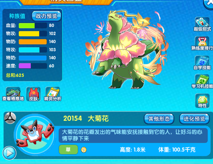 首先,大菊花的防御力是比较平均的,对比前面两个来说优势更大,而且专属也可以减伤,在属性方面也基本上可以完美联防巨沼怪的双本,而且在他的技能方案里面是有攻击类技能的,所以说不会像前面两只精灵遇到巨沼怪,只能够使用变化类技能劝退,他是直接可以使用草属性技能去打巨沼怪的。