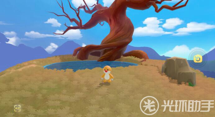 在湖泊处继续往前走有个小斜坡,斜坡上有一个小水池和一个大枯树