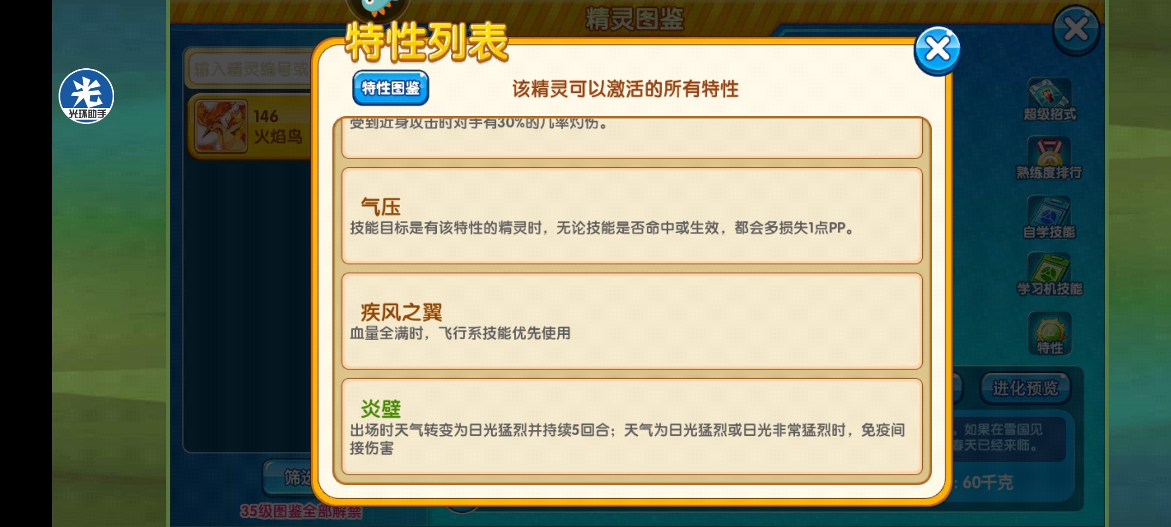 其他组合:阳光烈焰。顺风+急转,阳光烈焰配炎壁瞬发阳光烈焰打沼王。顺风+急转,用顺风快攻优势给攻击宠物制造先手优势。