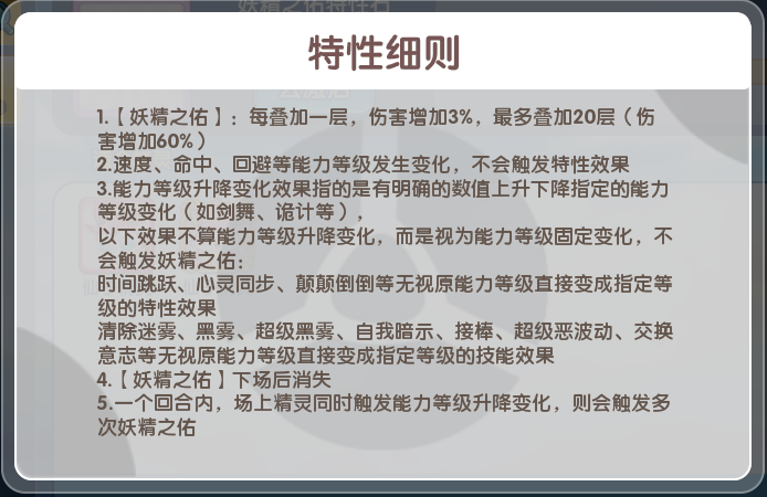 仙子精灵(瑟蕾娜的羁绊)拥有的特性包括:妖精皮肤、精神力和妖精之佑,前2个都是闪光形态的旧特性,不做赘述,这里重点说说新增的特性——妖精之佑。