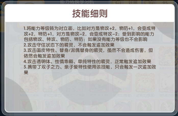魔法转换必备招式,本系加成和吸血,让仙子无需携带回复招式。影子攻心箭拥有比较稳定的输出量。集气是这个流派不可或缺的招式。剩下的攻击招式看阵容情况配备,能力转换功能性更高,月光束比较拼人品有概率逼退,三角镭射可以给对手上状态。总之,不要让输出停滞,开大集气后,就是莽!