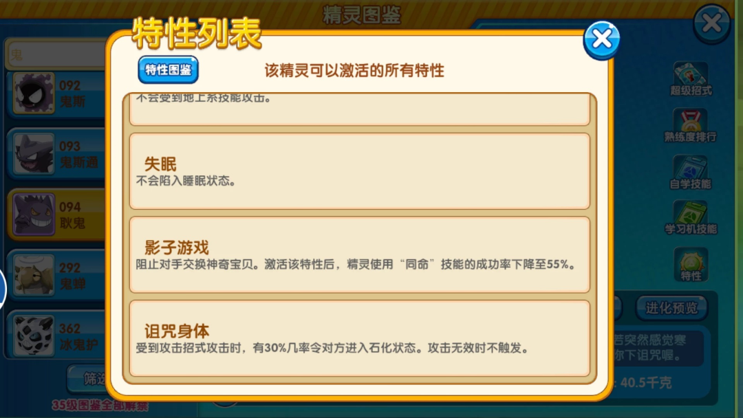 配招:挑拨+假指控/石化功+幽魂隔断(影子球)+泥浆波(臭泥爆弹) 讲解:挑拨非常有用,能够防止对方放骚扰技能逼退或劝退,也能防止对方无脑强化,而假指控的效果是让对方无法连续使用相同的招式,这个很有效果,尤其是针对那些带攻击技能少的宠物,而且也能防止对手携带节拍器叠加,石化功也是同样的道理,封锁住对手的克制技能,用后面两个配招打输出。这个套路也是以前十分恶心的一个配置,不过后来随着白鬼速度跟不上,用的人也就不多了。