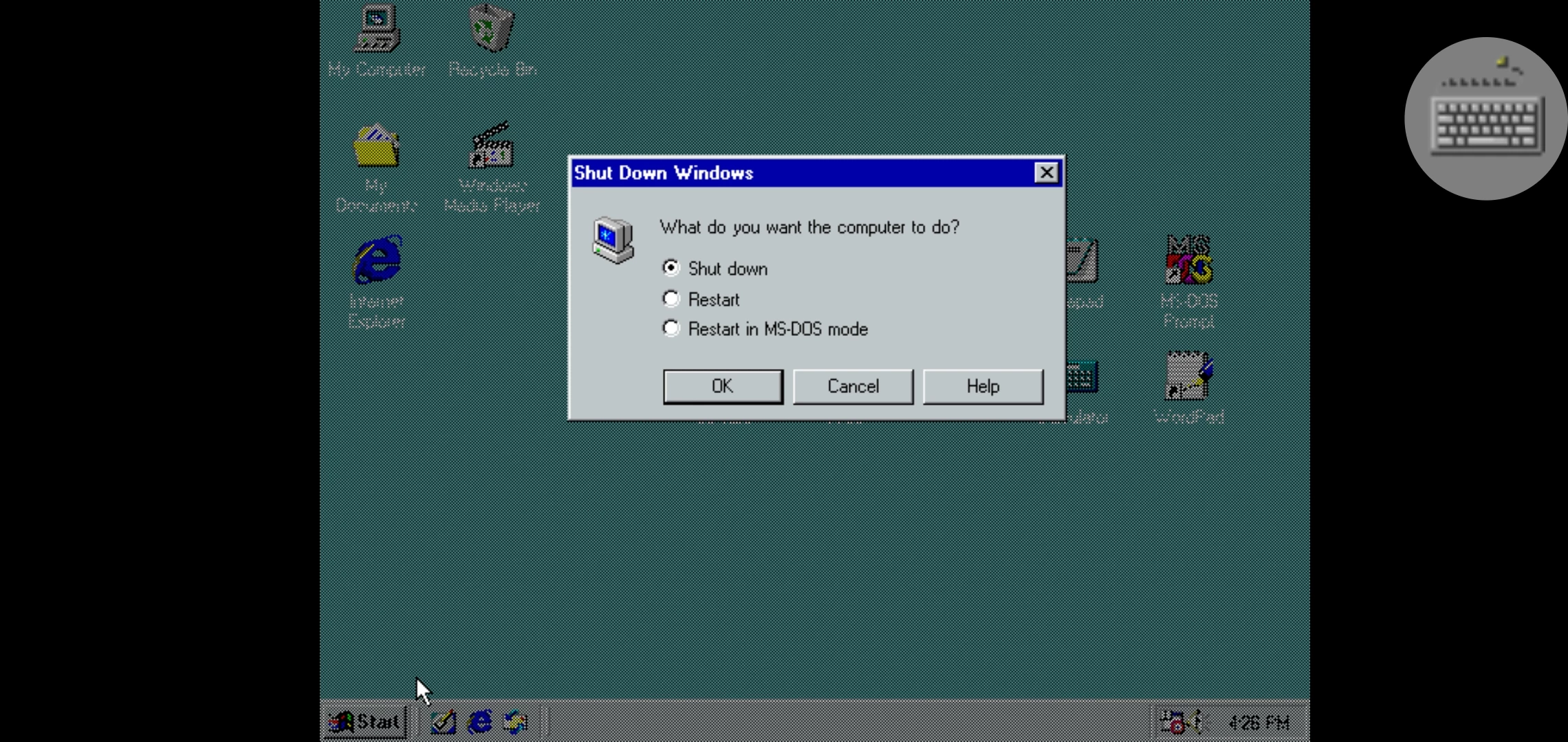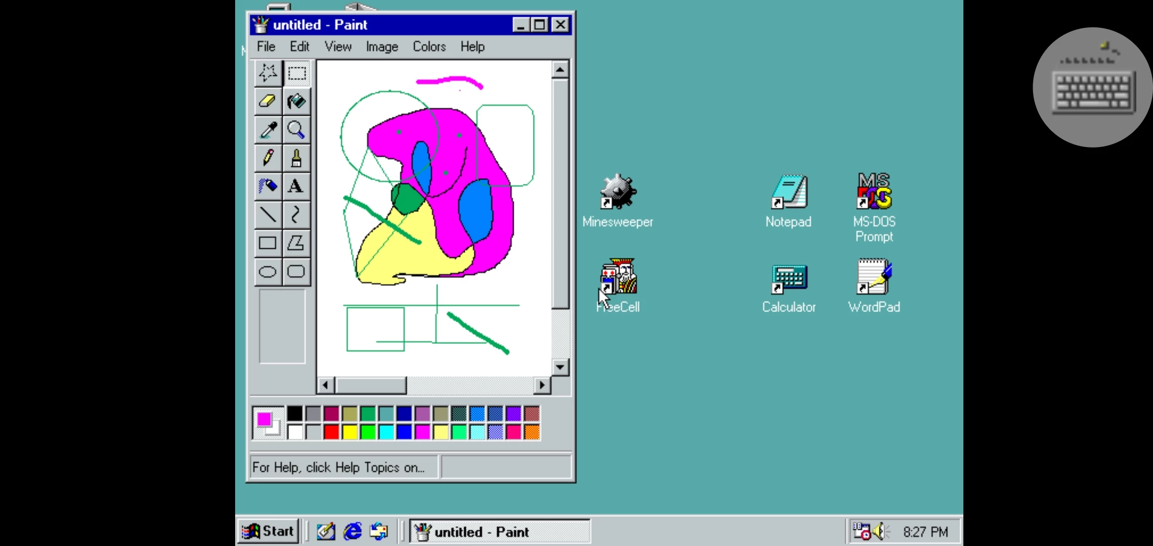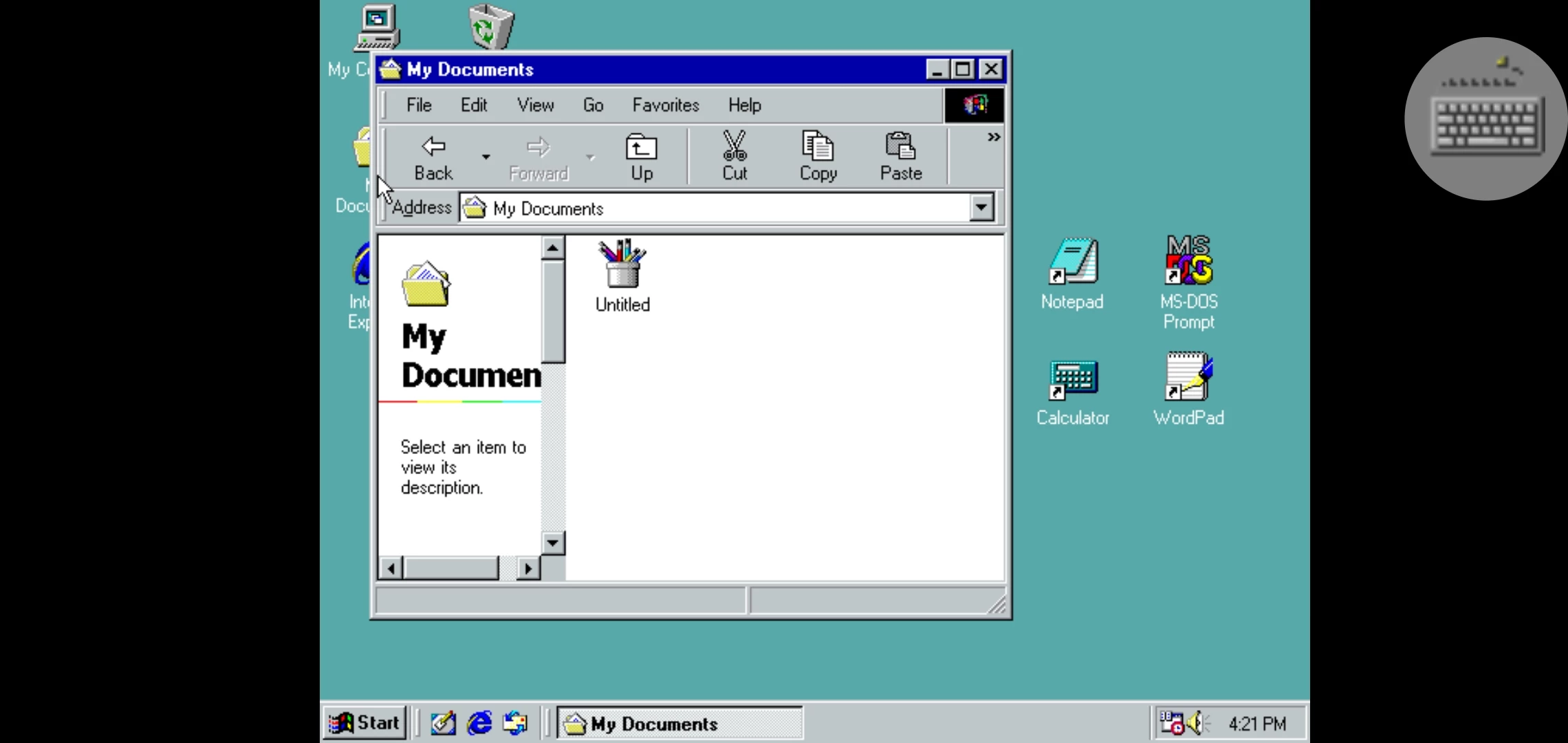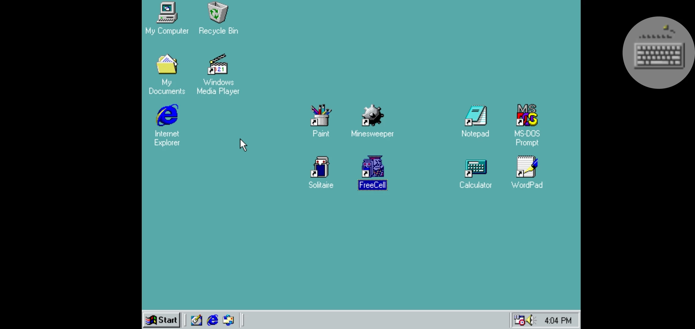 20年前的win98系统会有什么应用呢?回到桌面,虽然全是英文版本,但是可以看到熟悉的“我的电脑”、“我的文档”、“回收站”和“e”字这四个现在也有的版块。除此之外,还有“画图”和一些电脑自带的小游戏,而文字编辑方面,则有熟悉的笔记本记录,和雏形的word。