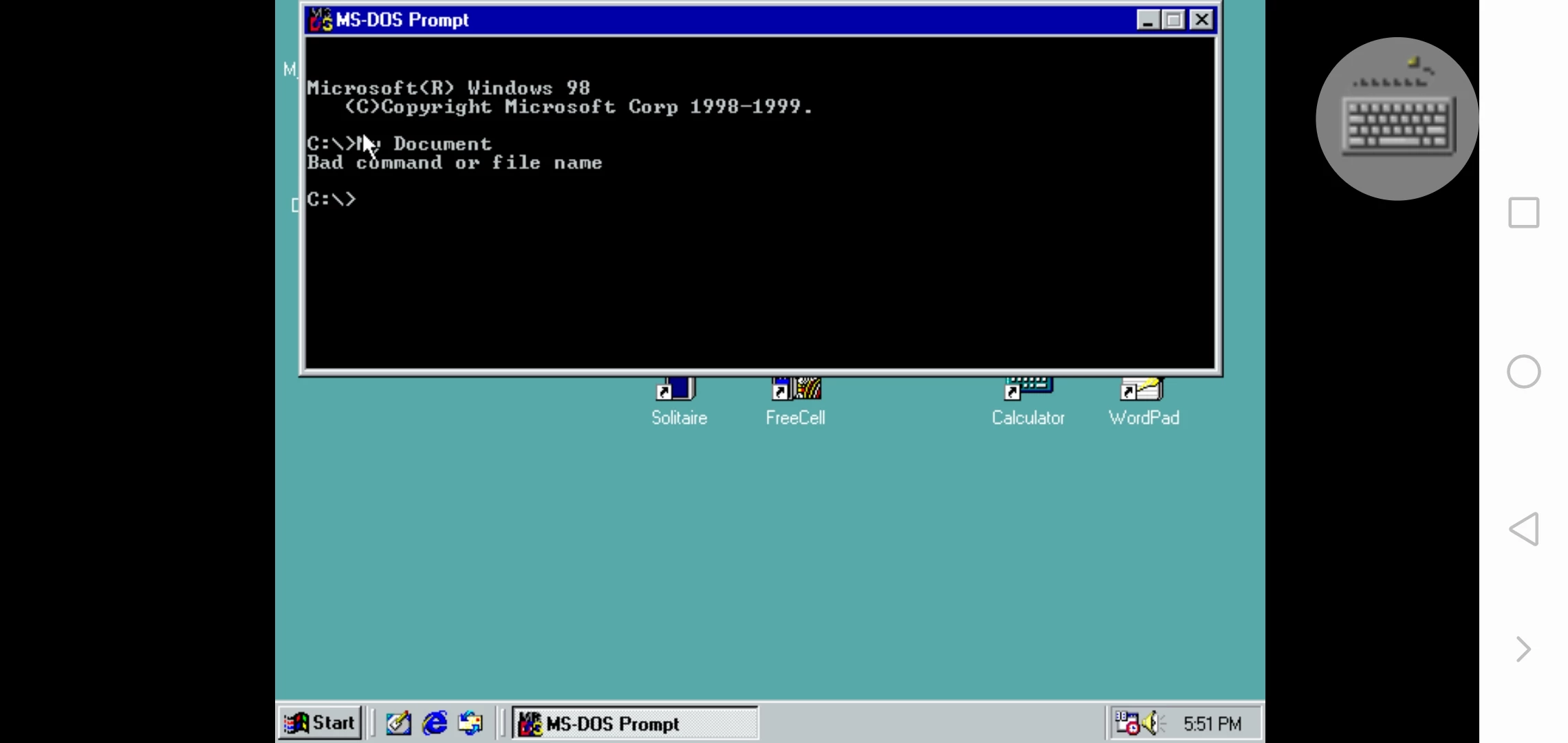 在桌面,小编还看到一个很陌生的“MS-DOS Prompt”图标,打开后发现页面像写代码一样,其实这个是电脑的命令行提示方式。以前的Windows系统需要使用命令行提示方式进入相应的用户界面,而从win98开始,就有直接点击图标进入到相应的用户界面这种方便的方式,不过为了让用户有适应的过程,win98系统兼容了两种方式,这是win98操作系统的一个进步。