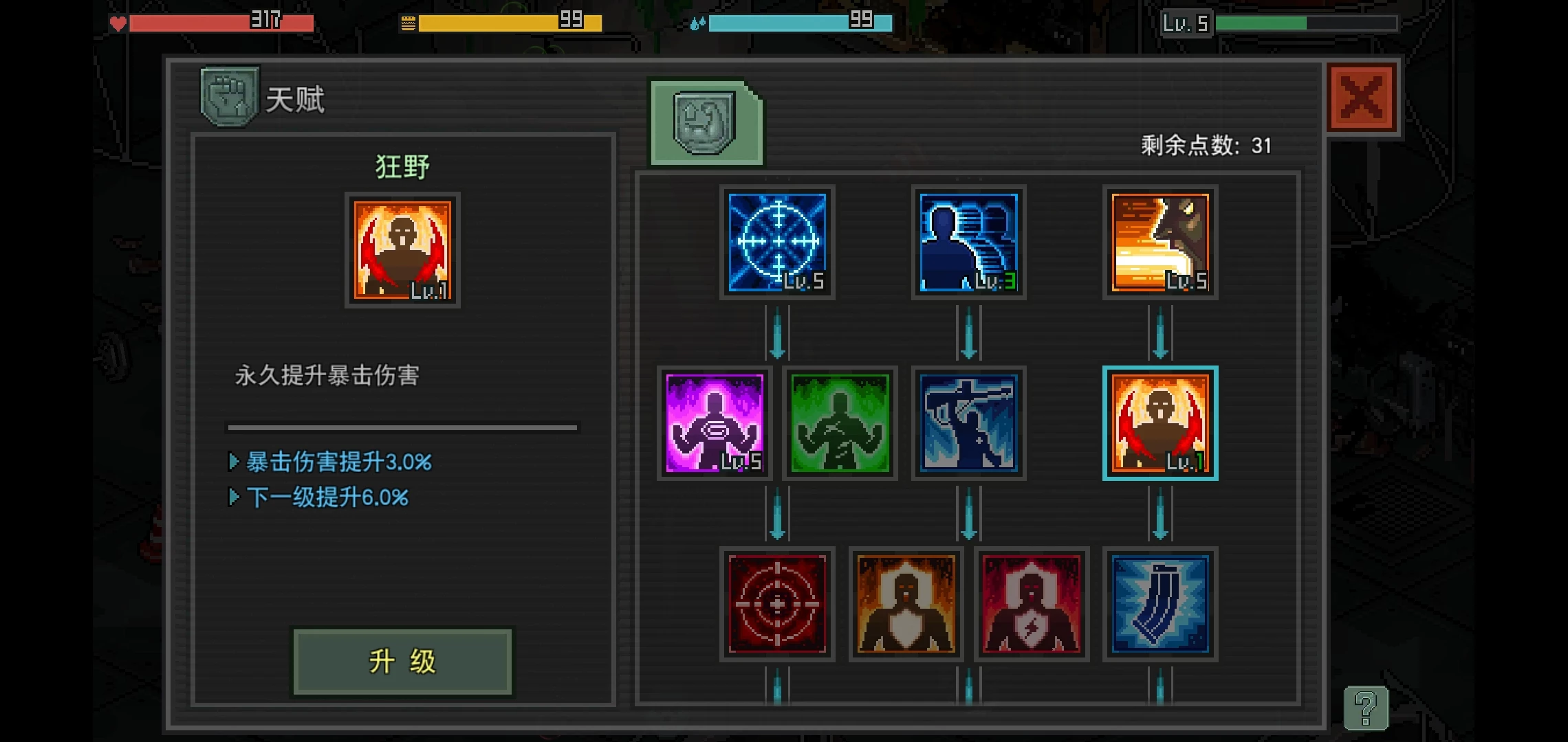 在战斗方面游戏像极了很多横屏的战斗游戏,拥有技能,拥有天赋点,还用有各种各样的武器。而在制造方面,游戏又像是一个荒野求生,收集各种材料,只要各种各样自己喜欢的物品。