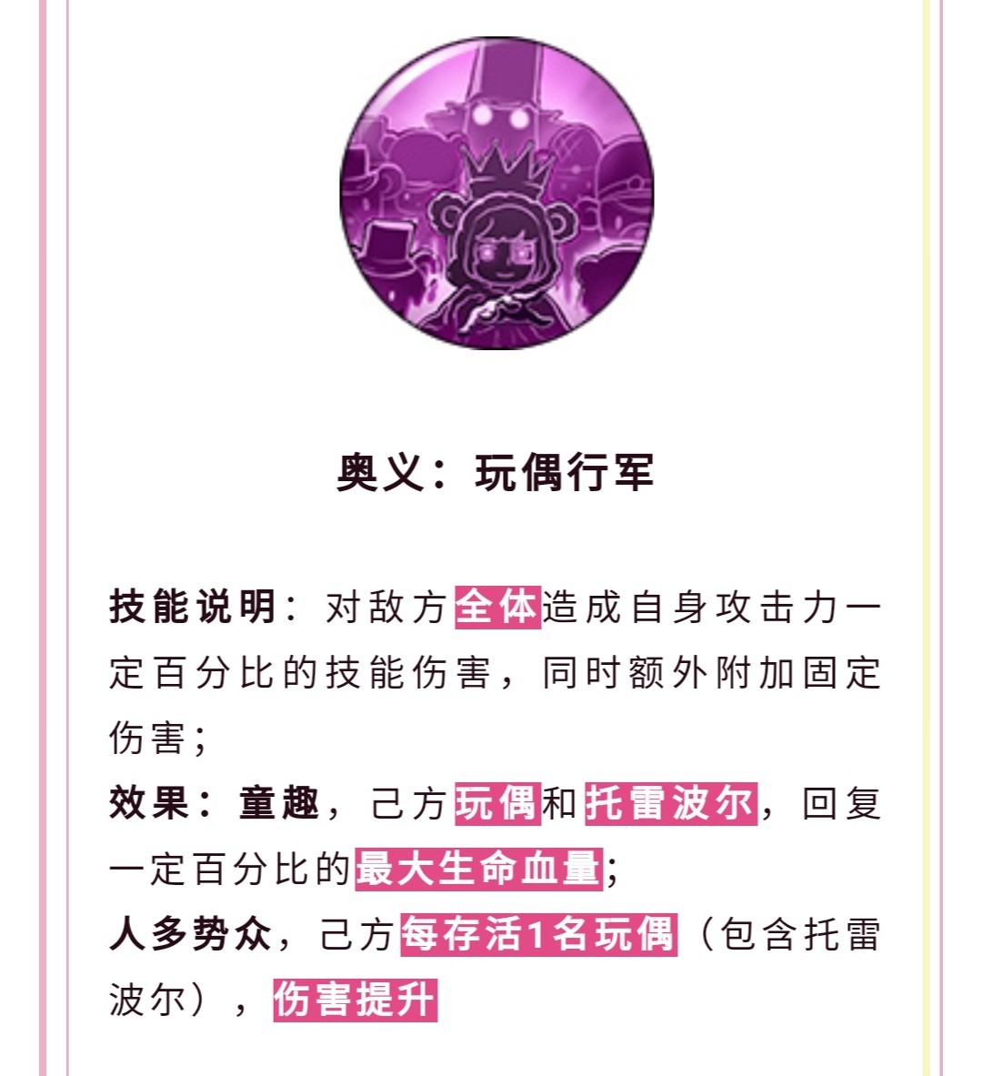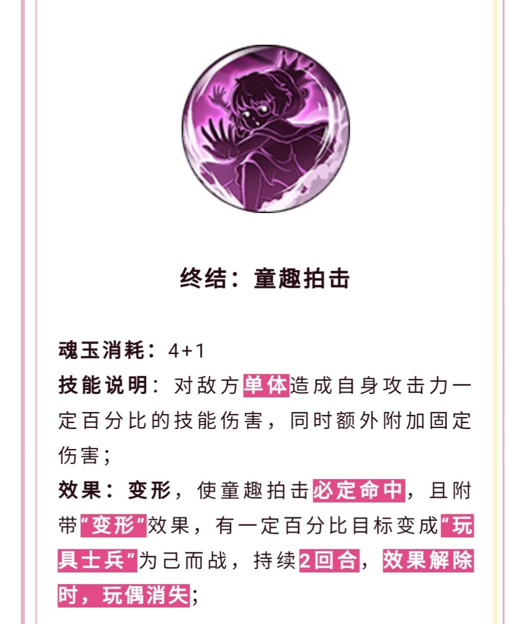 这个终结技是单体技能,附带必定命中和变形效果,可以把对方变成玩具士兵为己方而战,持续两个回合,这是一个新的机制,不知道把对方变成玩具士兵之后能不能释放技能,可以想象成大熊的拍飞,乔巴的放逐,黑胡子的虚空放逐。