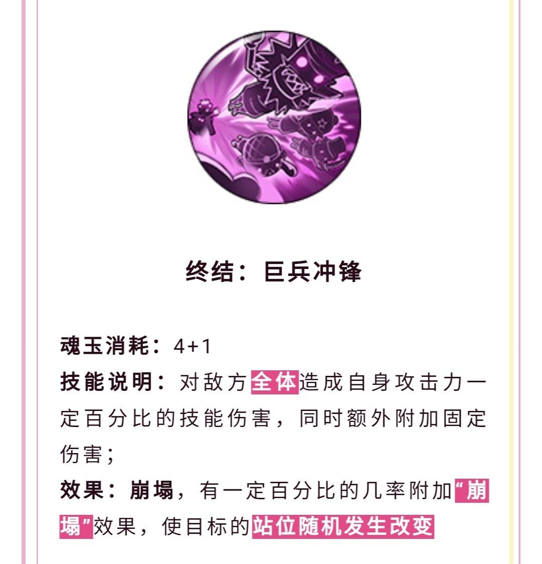 这个终结技是群体攻击,有崩塌效果,有一定百分比可以让目标的站位随机发生改变,可以参考白胡子的大招。
