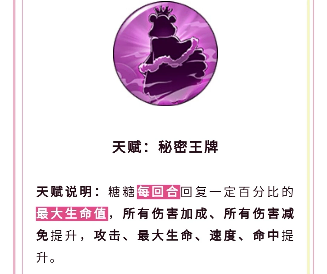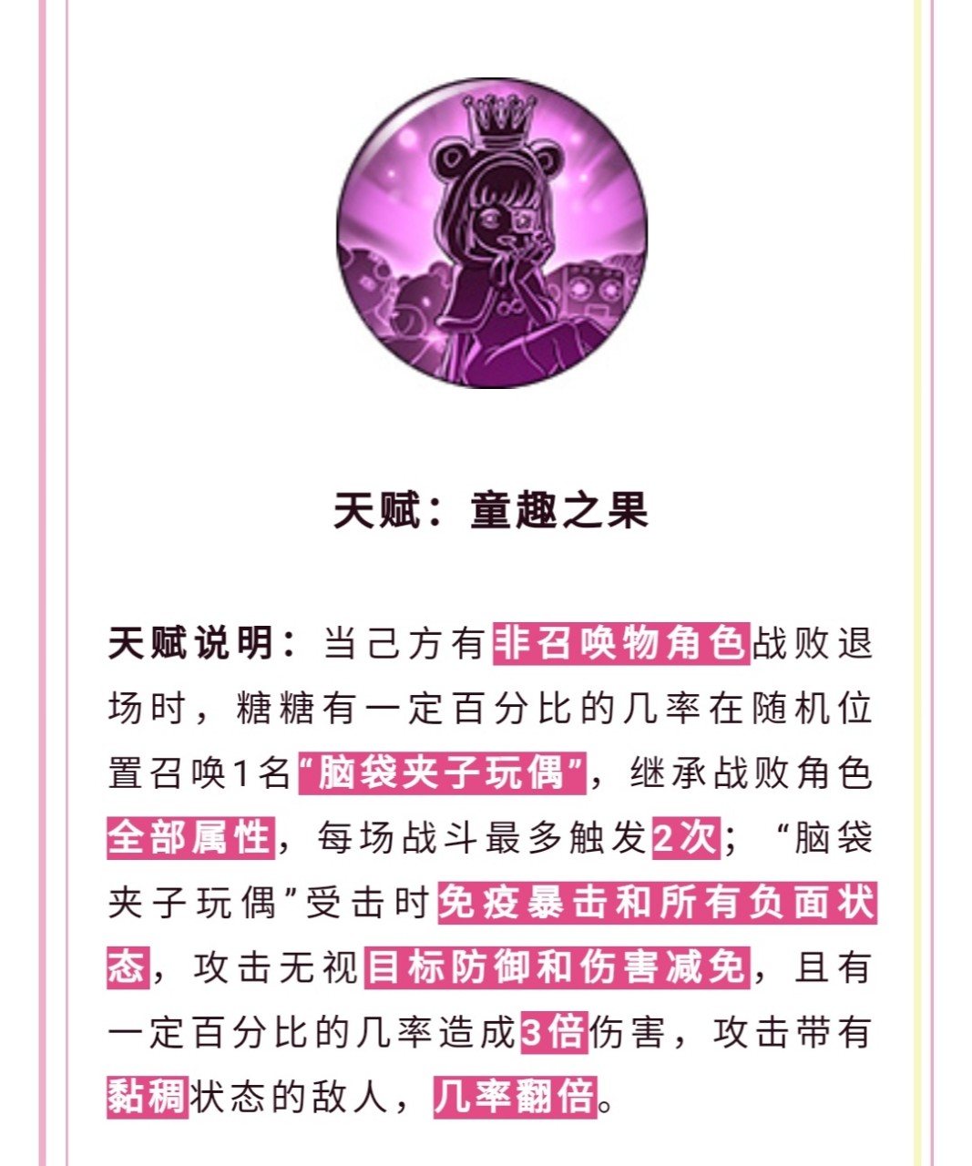 这个天赋应该是砂糖的8星天赋了,己方角色死亡之后,砂糖可以有百分比在随机位置放一个脑袋夹子玩偶,这个玩偶可就厉害了。
