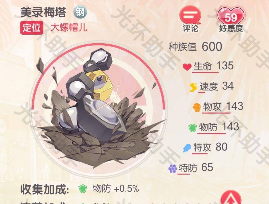 从种族值就可以看出,美录梅塔是一个防御向的精灵,一眼能看出的问题是速度比很低。因为外形的原因,也是被玩家们起了一个“螺丝帽”的外号。