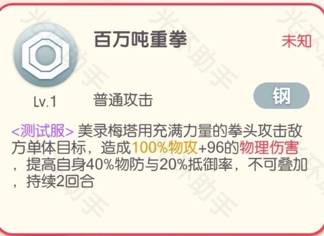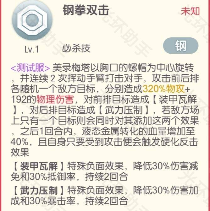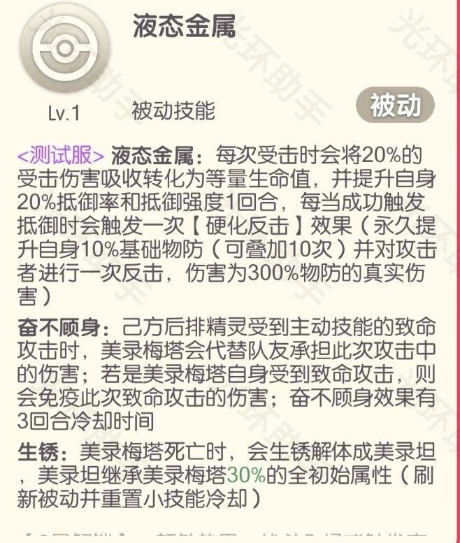 死亡后,美录梅塔会变成第一形态美录坦,也就是变成一个小螺丝帽继续投入战斗。 从技能截图上看,美录坦拥有美录梅塔30%的属性,但随着技能等级的提升是会增加的,90级可以继承原本50%以上的属性。并且还可以刷新被动的保护致死效果。八星被动: