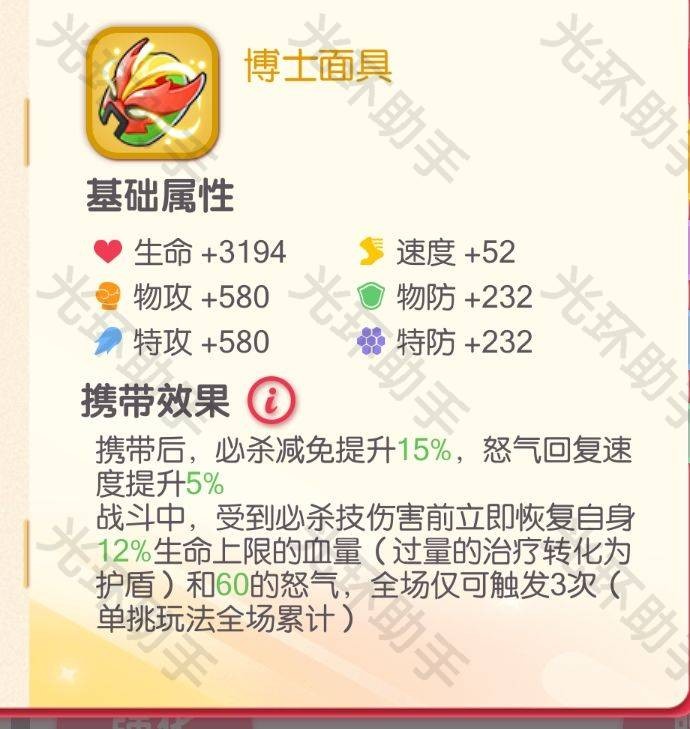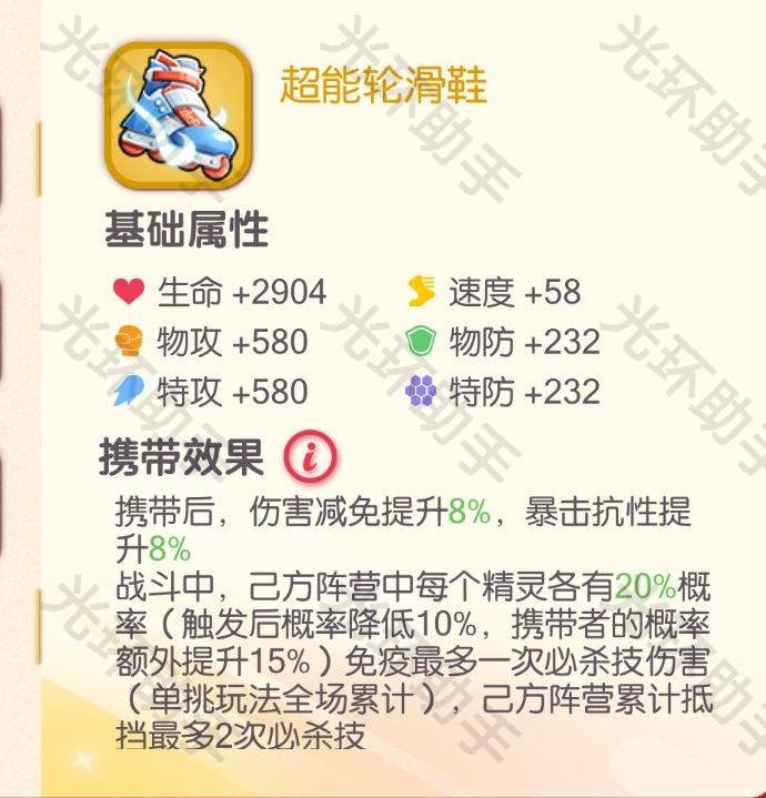 博士面具说过太多次了,基本上只要是带有防御能力的精灵,和谁都百搭,而轮滑鞋作为新出的道具,让队友概率免疫敌方必杀伤害的效果与美录梅塔被动抵抗致死的效果是比较契合的。