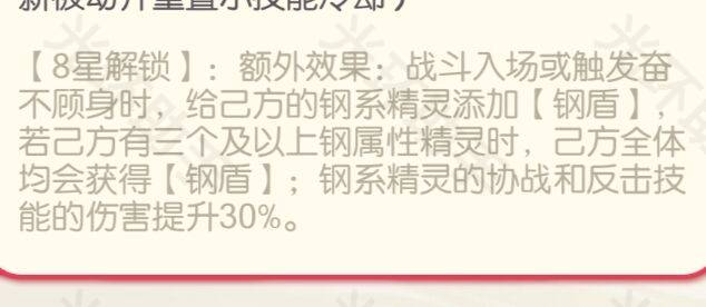 八星星级技能对于大多数人来说并不是很有用,主要是对钢系精灵的一个羁绊效果。大多数人是没有几个钢系精灵的。 但只要拥有三个钢系精灵就可以给全体施加护盾,前段时间的基拉祈正好也是钢系,如果你队伍里还有基拉祈和钢龙,那么正好可以达到这个效果。
