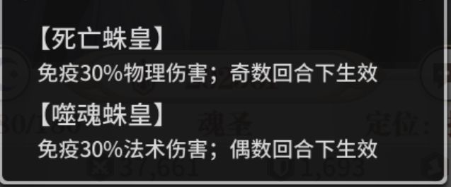 [死亡蛛皇]状态下受到攻击时有50%概率对攻击者附加[剧毒]效果; [噬魂蛛皇]状态下场.每个阵亡单位使比比东造成伤害提升20% (最多60%) ,