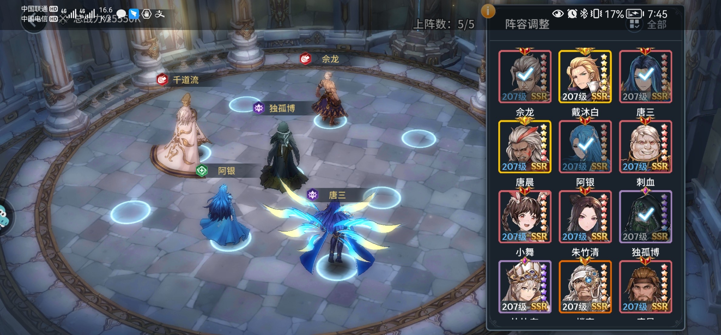通关阵容推荐:佘龙(主) 唐三(次) 独孤博(次) 阿银(工具人) 千道流(工具人)