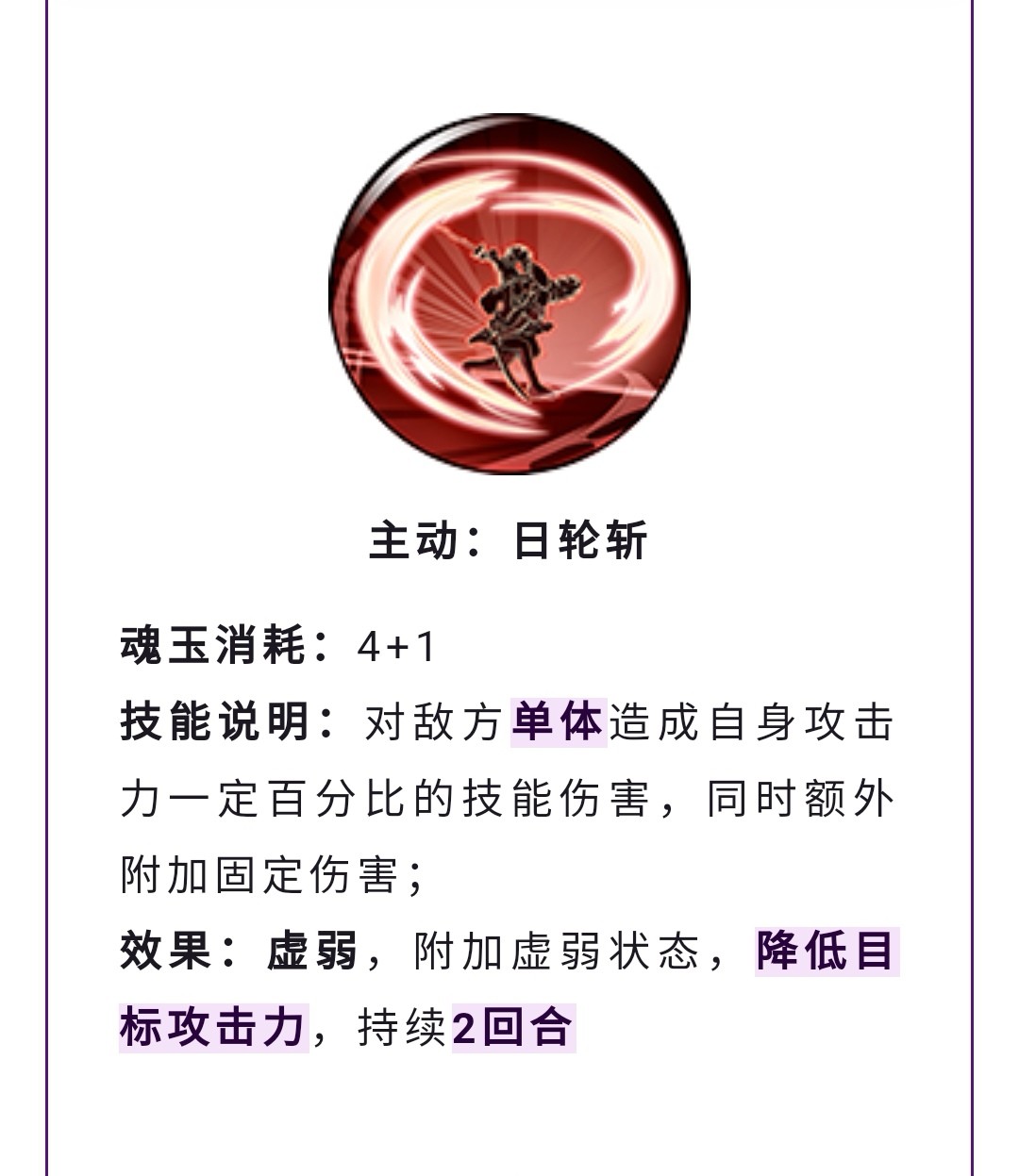 单体伤害技能,技能状态是虚弱,和新世界马尔高的单体主动效果一样,算是中规中矩的一个小技能,面对免负或者免疫单体技能的角色可能打不出效果。
