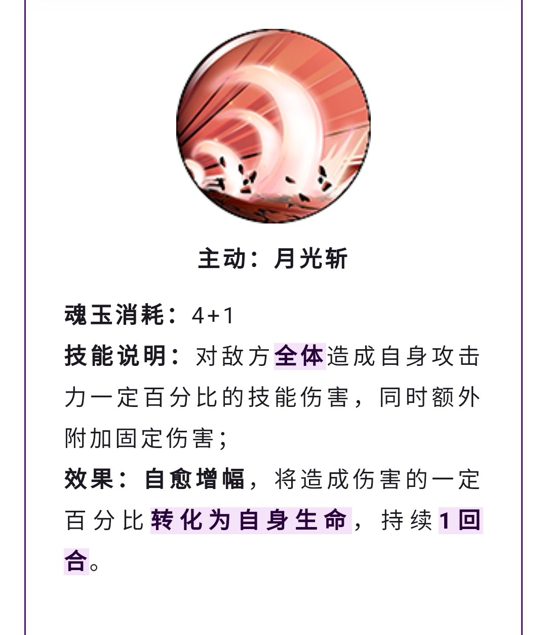 全体伤害技能,状态为自愈增幅,可以获得吸血效果,类似新世界鹰眼的终结技效果,可以保证御田的血线健康,全体伤害也能保证不破鹰眼剑势,算是个必带的技能。