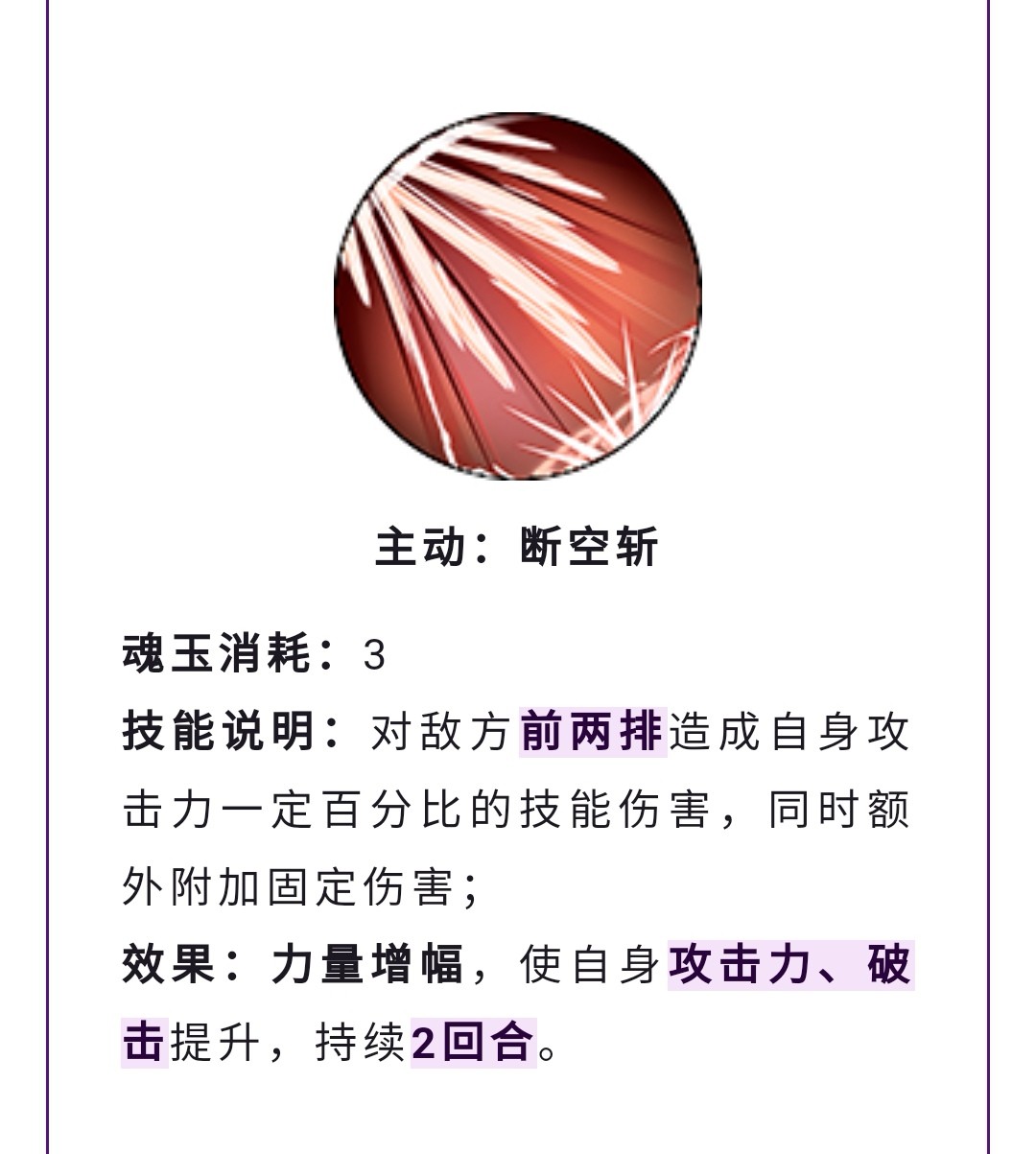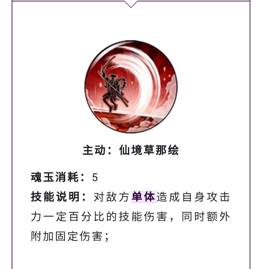 战斗开始每回合获得额外魂玉和怒气,目测应该是5魂玉和50怒气,所有技能附带火属性伤害,首回合血量不会低于一定百分比,让御田的生存能力大大提高,拥有类似凯多的锁血,让御田可以放心输出。光月族长