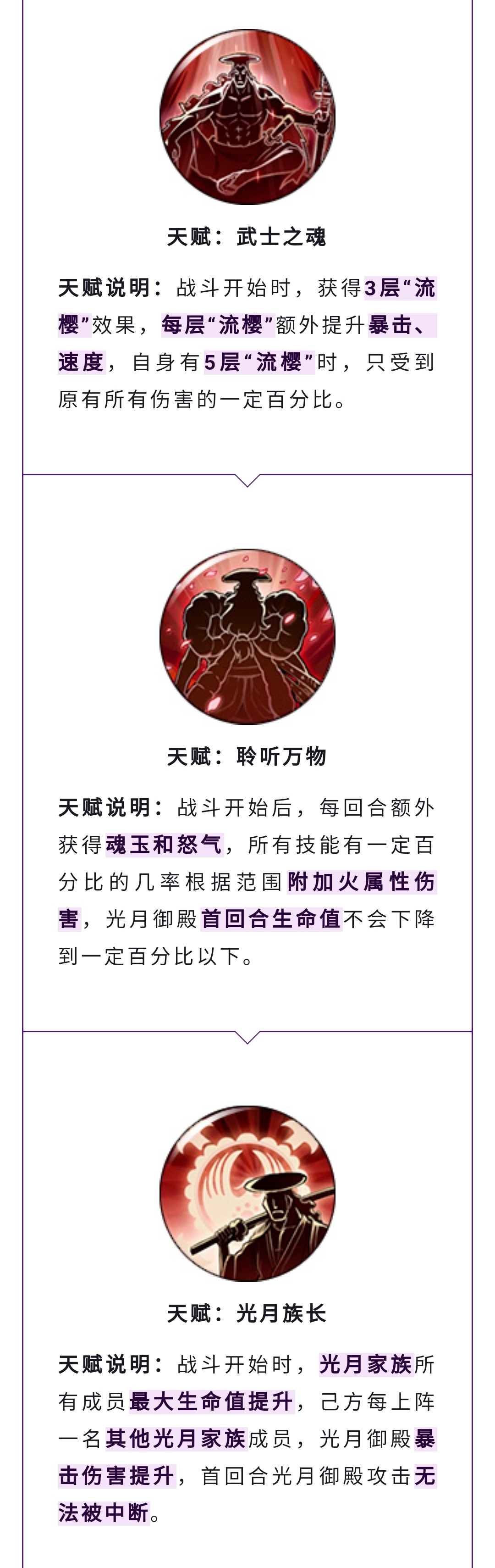 战斗开始提升光月家族最大生命值,每上场一名光月家族成员提升御田的爆伤,首回合御田的攻击无法被中断。这个天赋暗示了将来出光月家族其他角色的可能,首回合御田的攻击无法被中断也保证了不惧怕白马的中断或者被小马复活卡技能,算是个非常强力的技能。评价