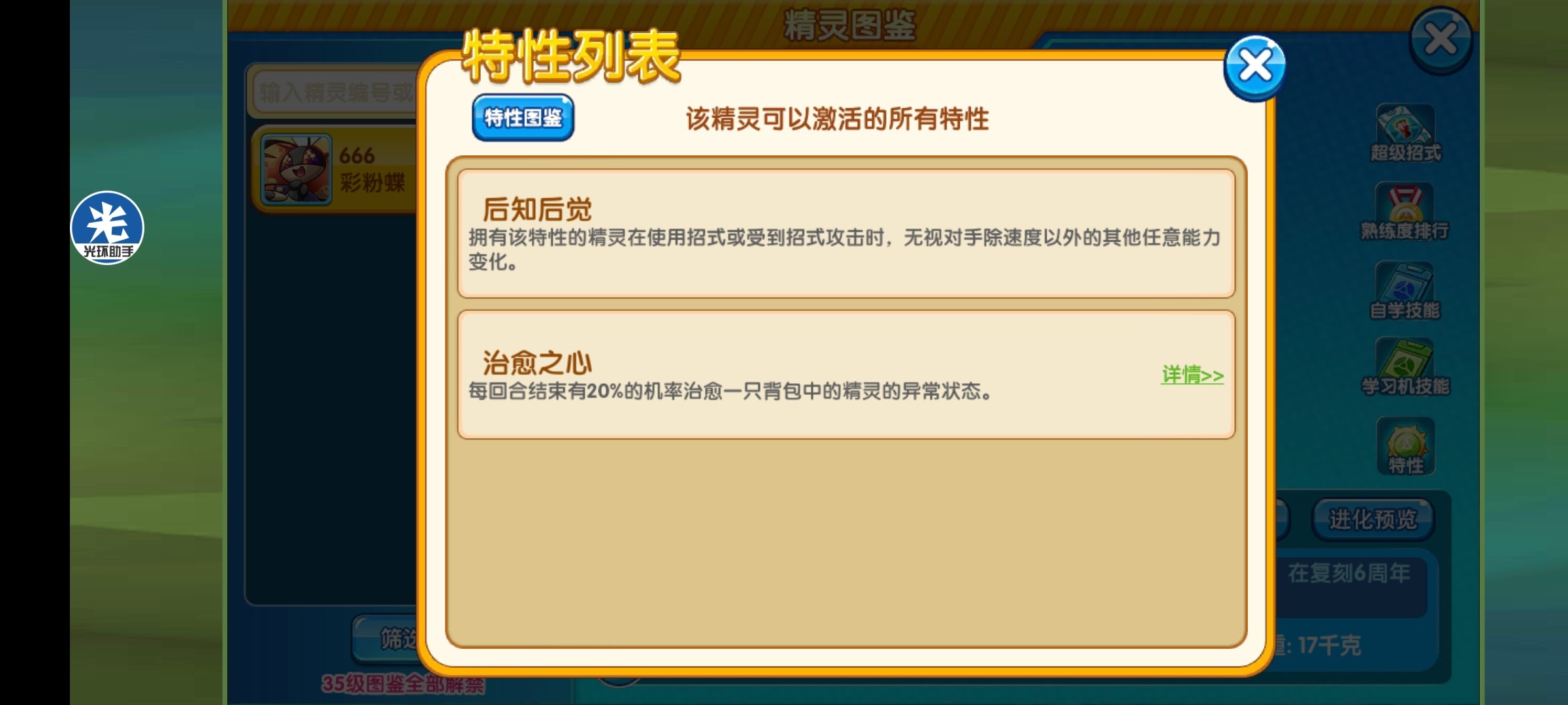 如图,特性有两个,但只推荐后知后觉,无视对手的能力变化,这点很重要。它的玩法一般也都是凭借后知后觉,虽然不一定当盾,但是自己可以强化而无视对手强化,这也很关键。
