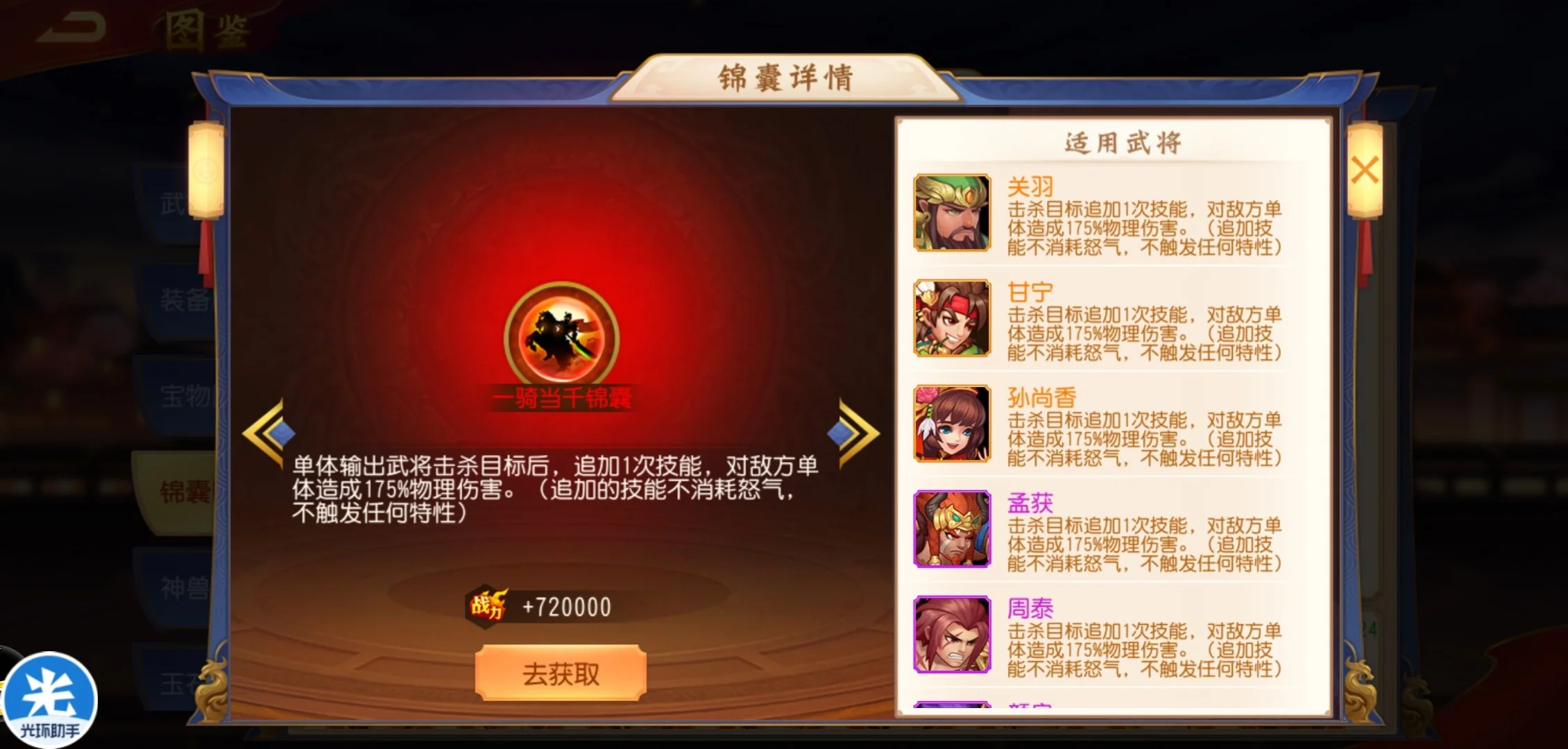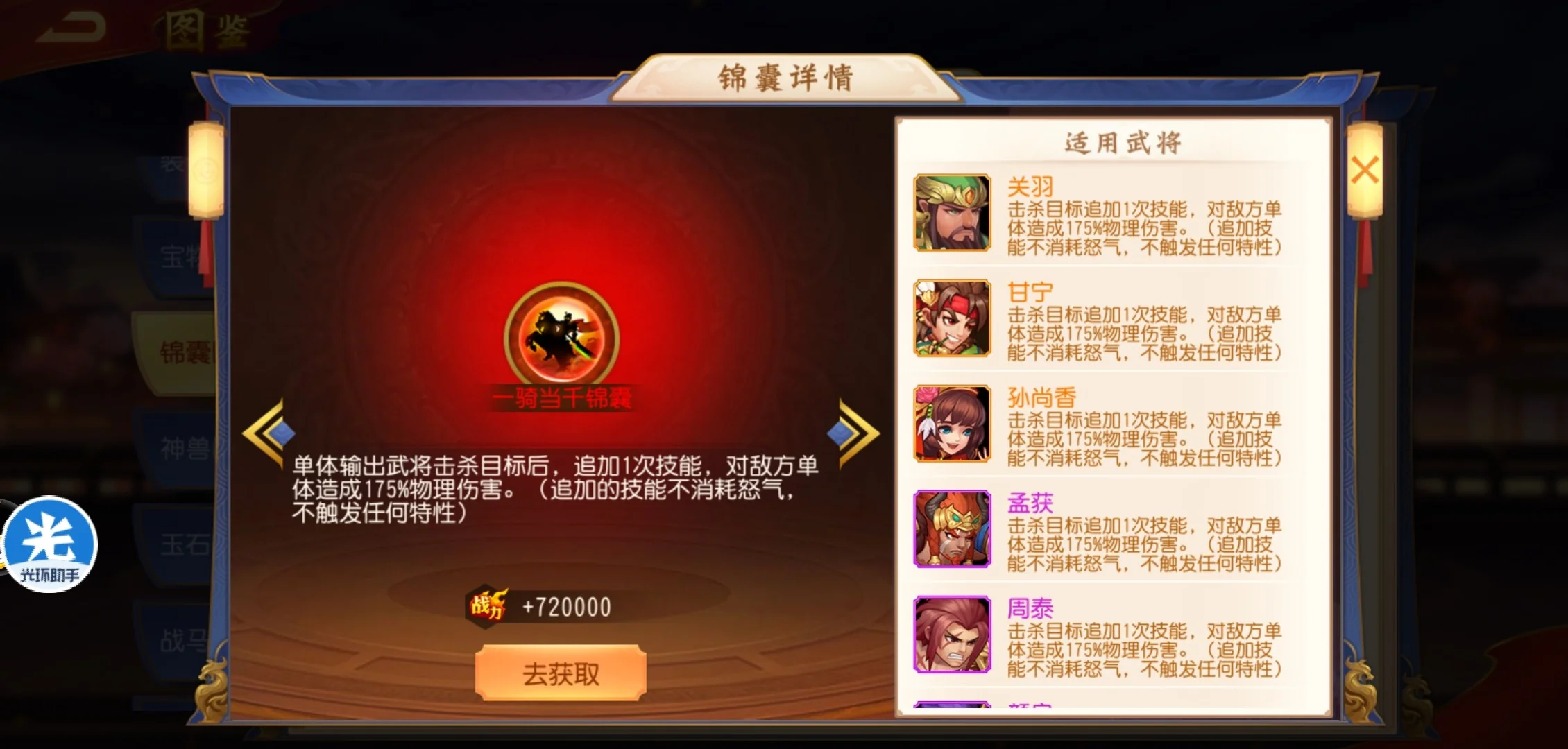 并且佩戴上一骑当千锦囊,也是追击一次技能,同样是175%物理伤害。