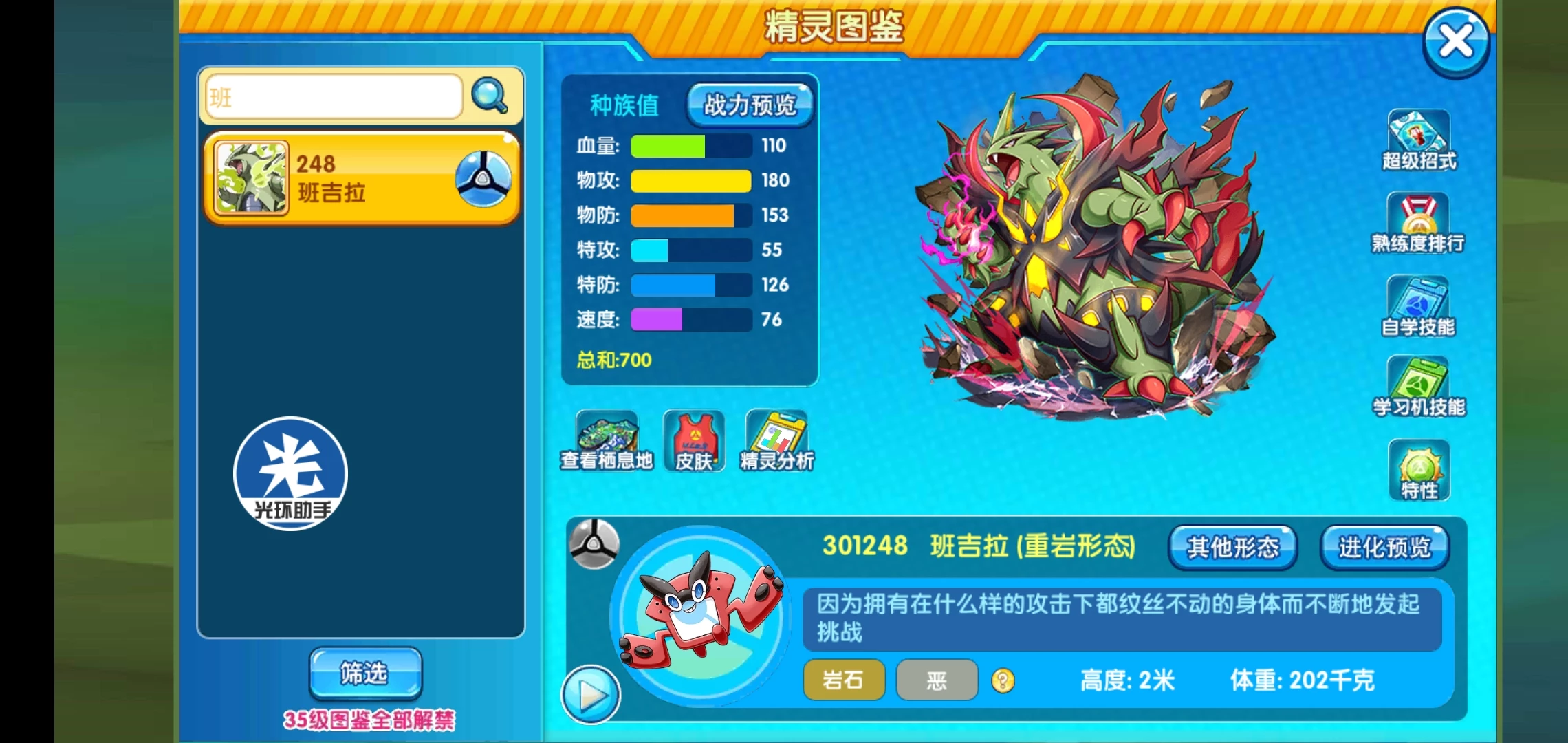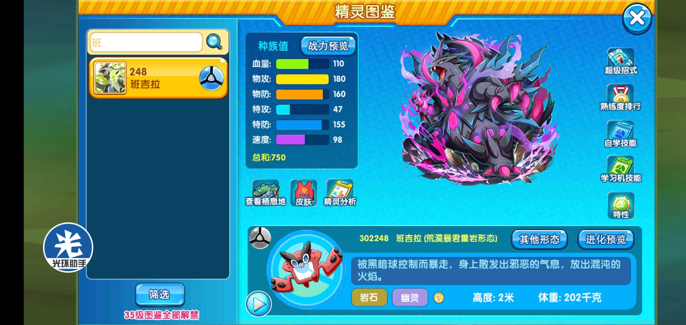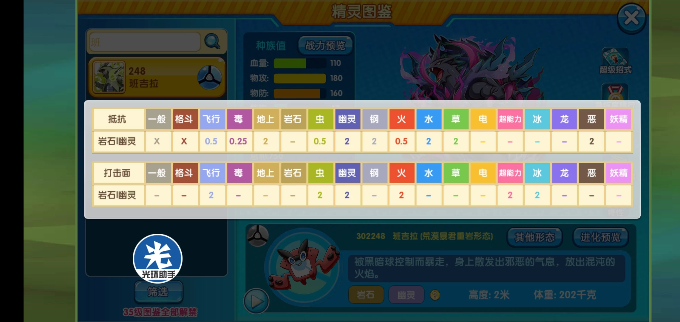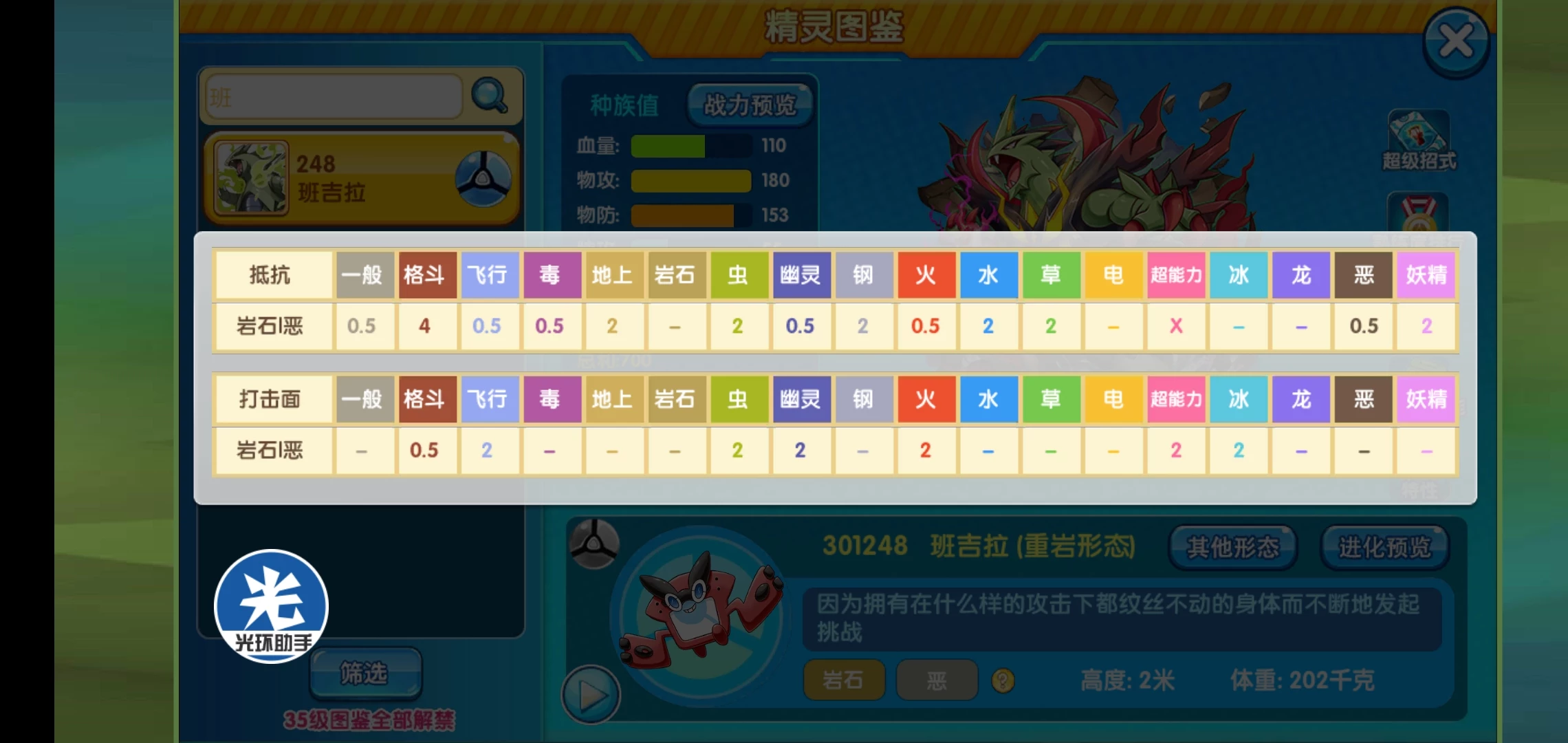 综合说明:班吉拉有两个形态,不光种族,属性都一样,对这两个属性大家各有看法,有人觉得原来岩石+恶就很好,但是弱四倍格斗,有人觉得现在的鬼+恶不错,可是打个Y鸟都容易被秒杀,其实在我看来。这两个属性的玩法根本就是两个样子,你看普通班,明显就是个防御,可以把它像特盾的方向培养,在沙暴下还是十分优秀,可以抵抗很多特攻手,我测试过,即便暴力的水龙、虫神都无法在沙暴天气秒杀它,它也完全有成为特盾的资本,变化技能也足够。至于鬼班,就是个强化的暴力推队手,它的强化方式有龙舞、剑舞、和集气,我觉得集气最好,暴击一下一个小朋友,双本都是高威力技能,打击面还算可以,至于速度可以让队友通过顺风或者超级冲浪弥补。