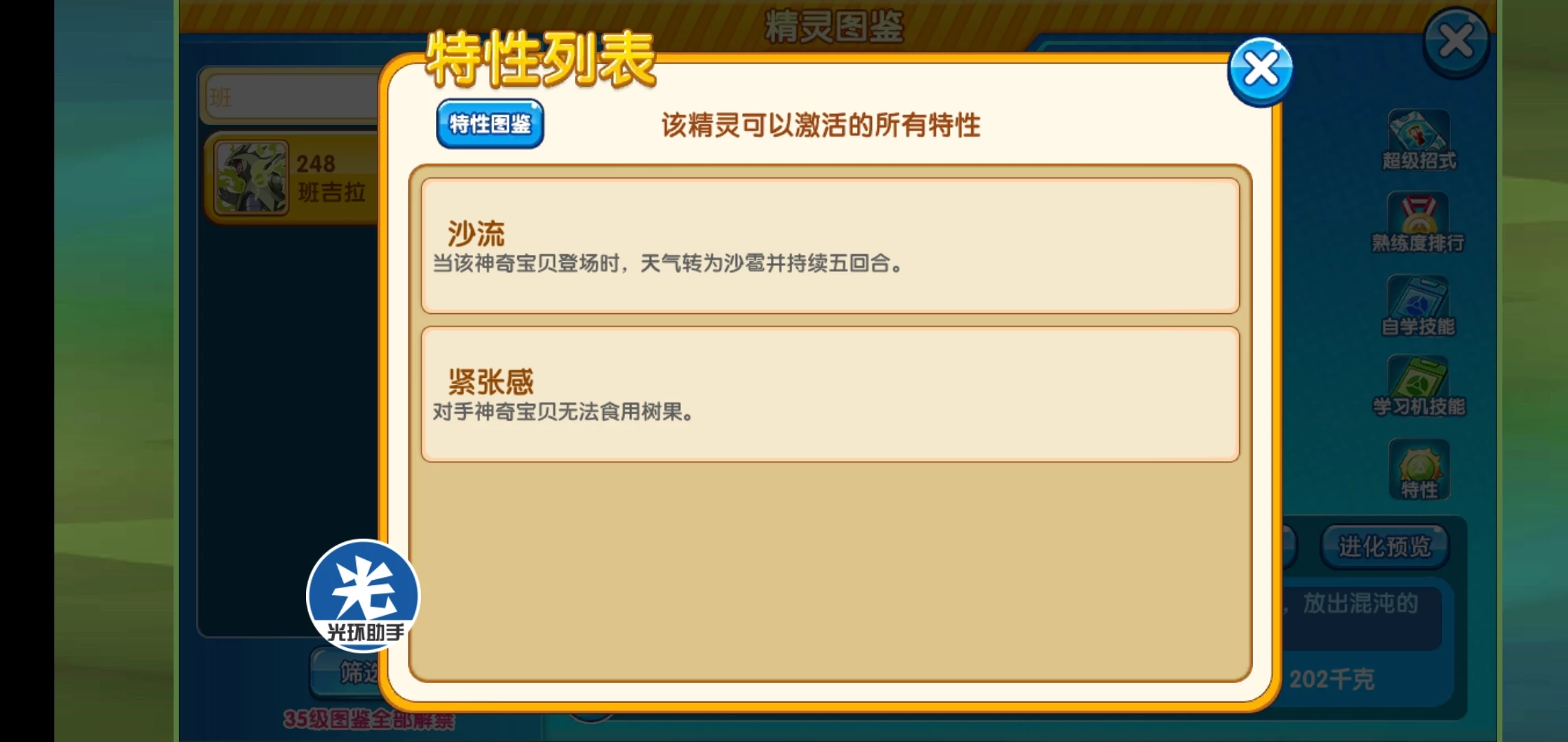 沙石沉积:沙暴、扬沙天气时回复血量;不是沙暴、扬沙天气时使用失败,沙暴天气回血量是半血。野蛮冲刺:攻击对手,有概率让对手麻痹,麻痹概率20%,是95威力恶系技能,pp量15,命中100。