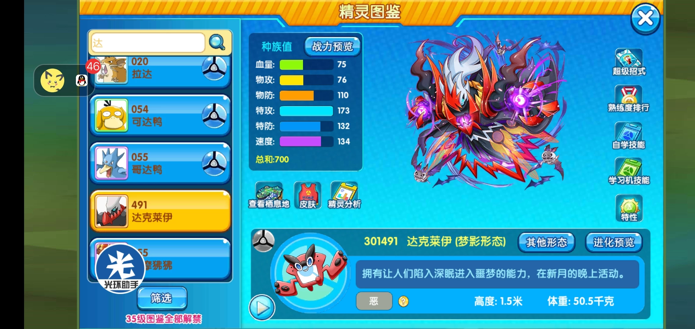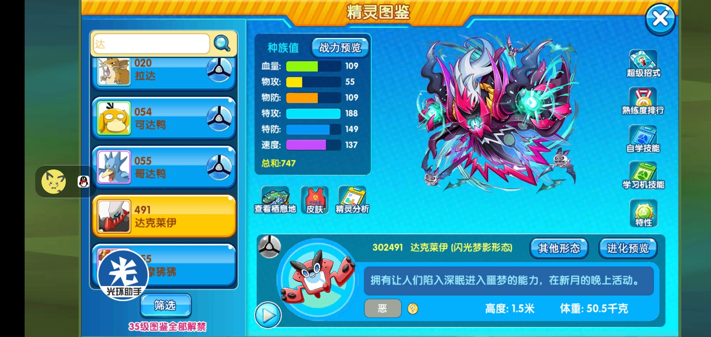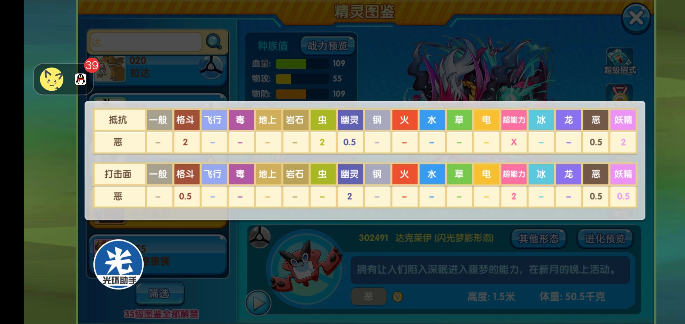 噩梦还是拥有双形态,闪光和普通,闪光的几乎全部有用属性都高于普通,但是物防例外,这也是复刻中极其少的免费宠有效种族居然高于闪光种族的情况,虽然普通110,闪光109,但这种事情几乎没出现过,再看特攻特防和速度,可以看出它是个标准的速攻手,闪光血量也有109,保证了它的身板不会太脆,但普通生命只有75,所以物耐是个弱点。属性:恶系