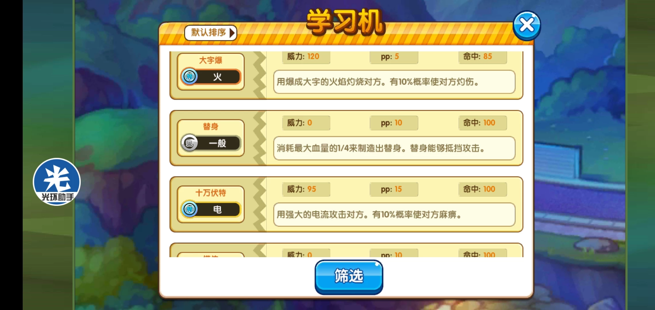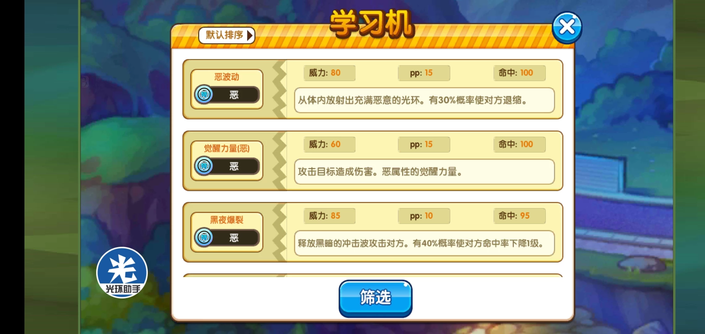 黑洞、急冻光线、十万伏特、影子分身、替身、冻风、幽魂隔断、假指控、挑拨、落拳、恶波动、集气弹、诡计、隔空切断、宝石闪耀、剧毒爆弹。
